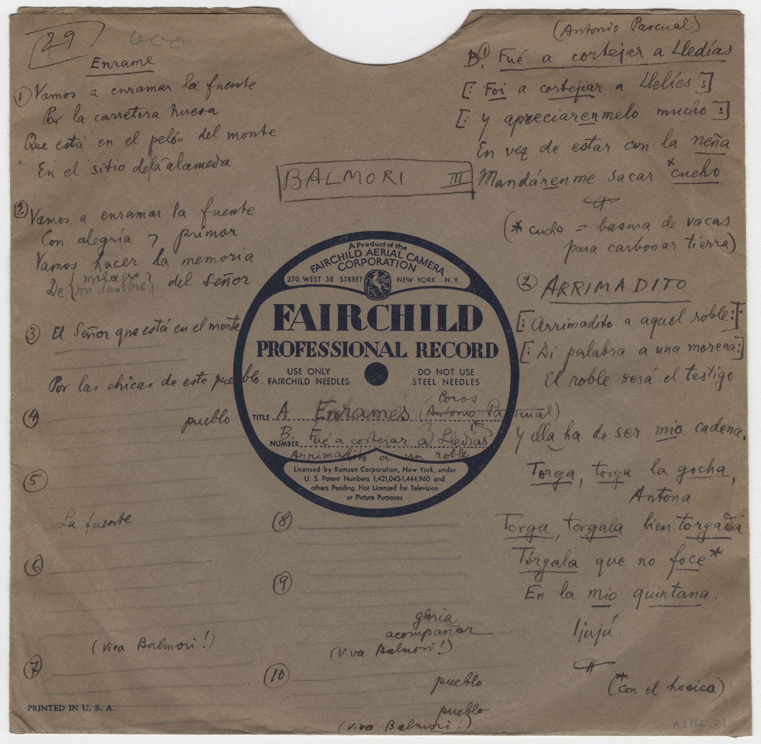 Descripción física: Disco de aluminio. En la etiqueta lleva manuscritos el lugar, los títulos de las canciones y el intérprete, Antonio Pascual. En la carátula tiene anotadas, además, las letras de las canciones.