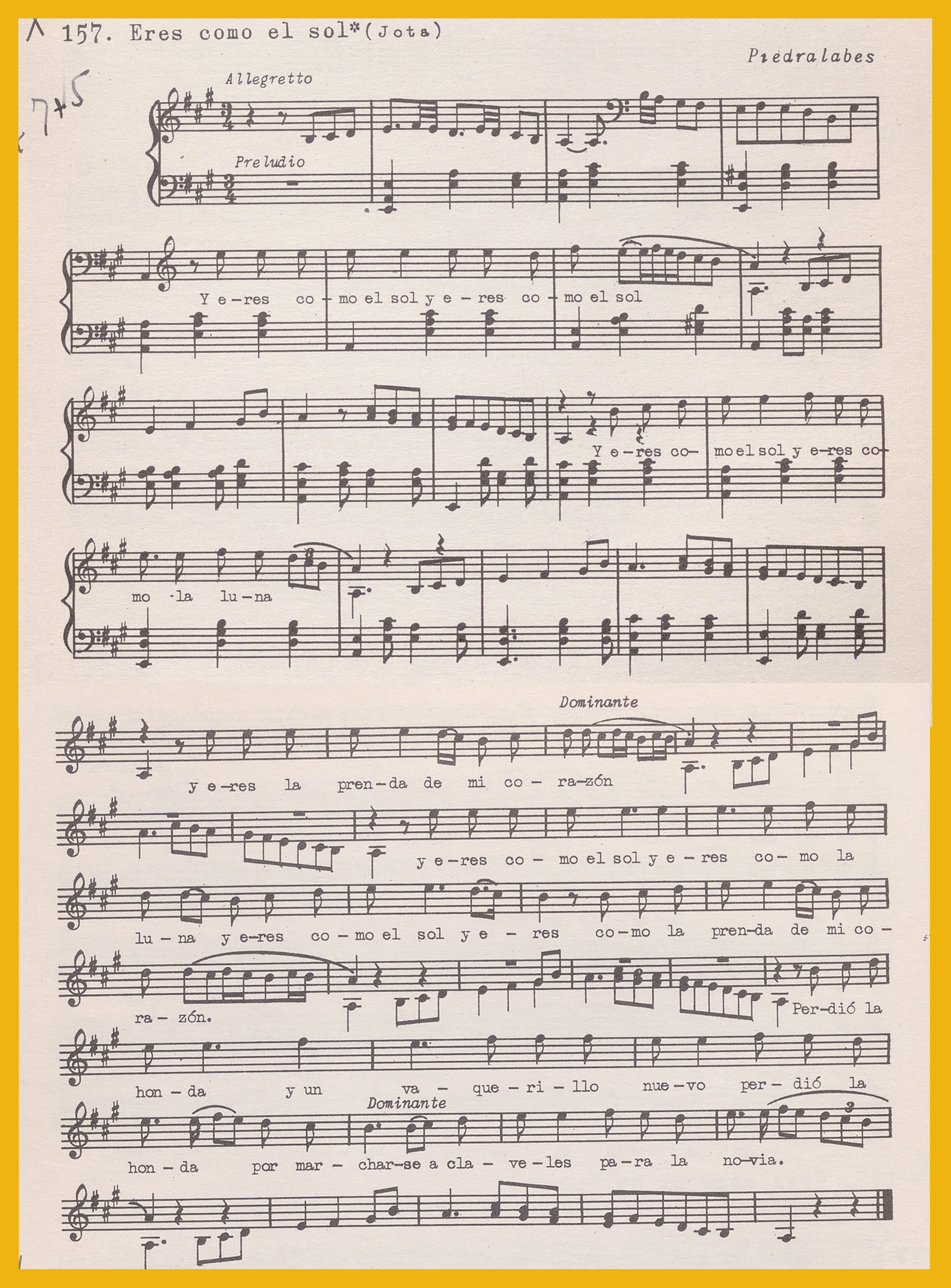 Ref. Partitura transcripción Kurt Schindler (1941): A. Romance: corresponde a «Los dos más dulces esposos (Romance)», nº 156. B. No aparece como tal en los registros. La jota que aparece registrada seguida de la anterior: «Y eres como el sol». Está señalada en el disco 32 como “Seguidillas” con ese mismo íncipit, y en partitura como Jota de Piedralaves, nº 157