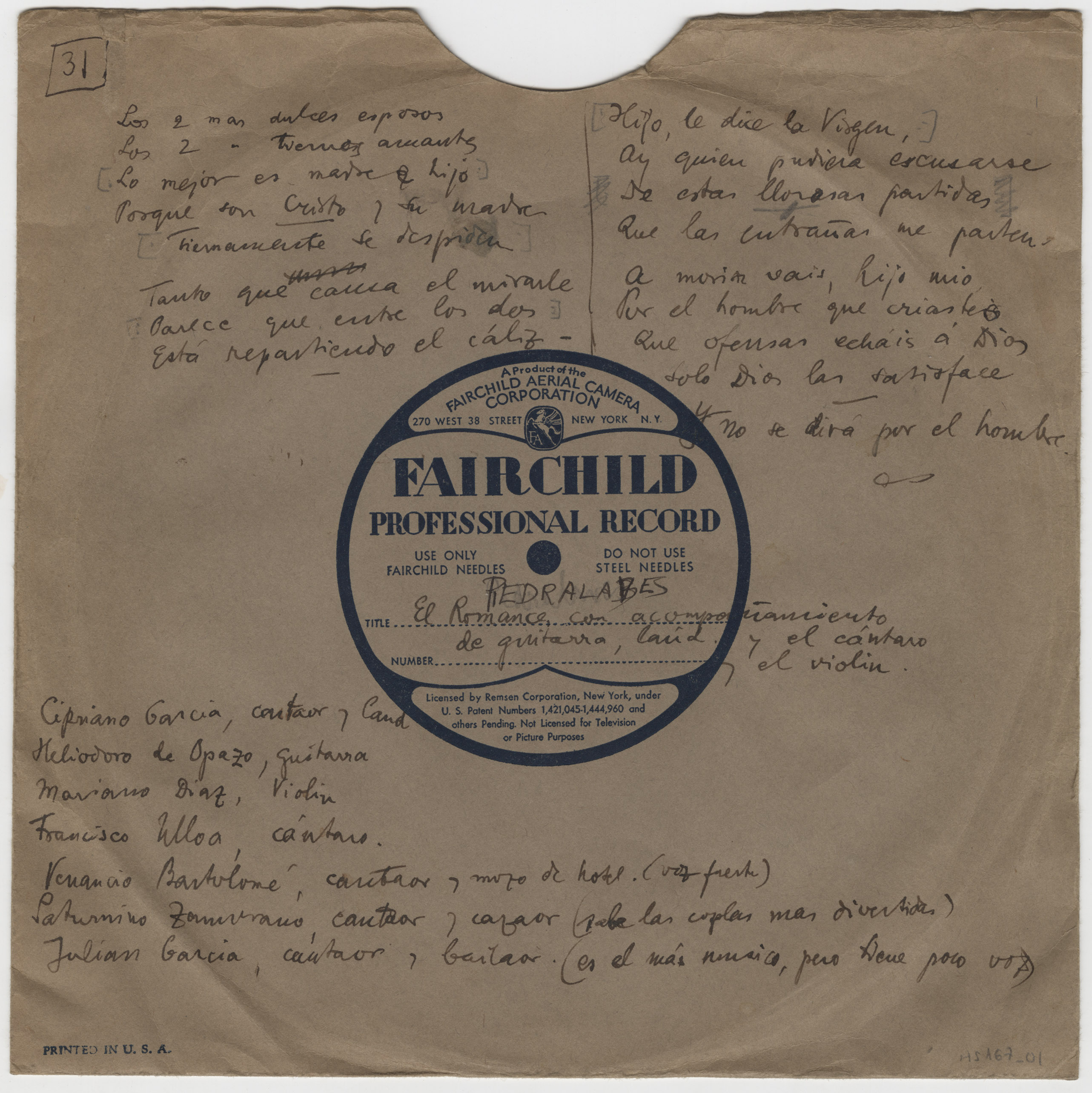 Descripción física: Disco de aluminio. En la pegatina lleva anotados el lugar y los títulos. En el sobre las letras de las canciones e indica " el Romance con acompañamiento de guitarra, laúd, el cántaro y el violín. Además, los Intérpretes: Cipriano García, cantaor y laúd. Heliodoro de Opazo, guitarra. Mariano Díaz, violín. Francisco Ulloa, cántaro. Venancio Bartolomé, cantaor y mozo de hotel (voz fuerte), Saturnino Zamorano, cantaor y cazador (sabe las coplas más divertidas). Julián García, cantaor y bailaor (es el más músico, pero tiene poca voz)
