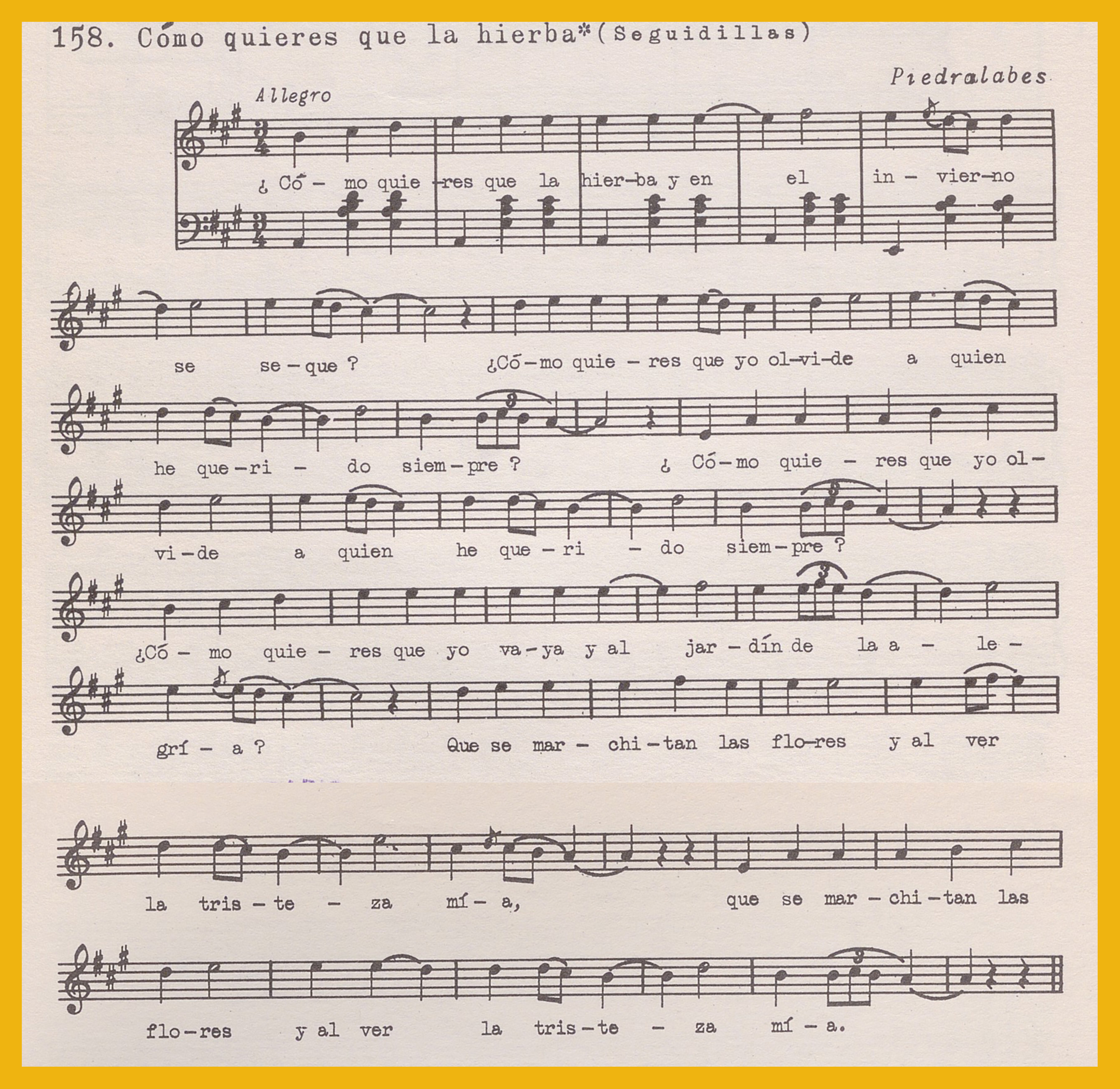 Ref. Partitura transcripción Kurt Schindler (1941): A. Seguidillas: corresponde en los registros a la jota «Y eres como el sol», nº 157. B. Jotas: Esta jota aparece en los registros en partitura como “seguidillas”: «Cómo quieres que la hierba». Está señalada en el disco 32 como “Jotas” con ese mismo íncipit, nº 158