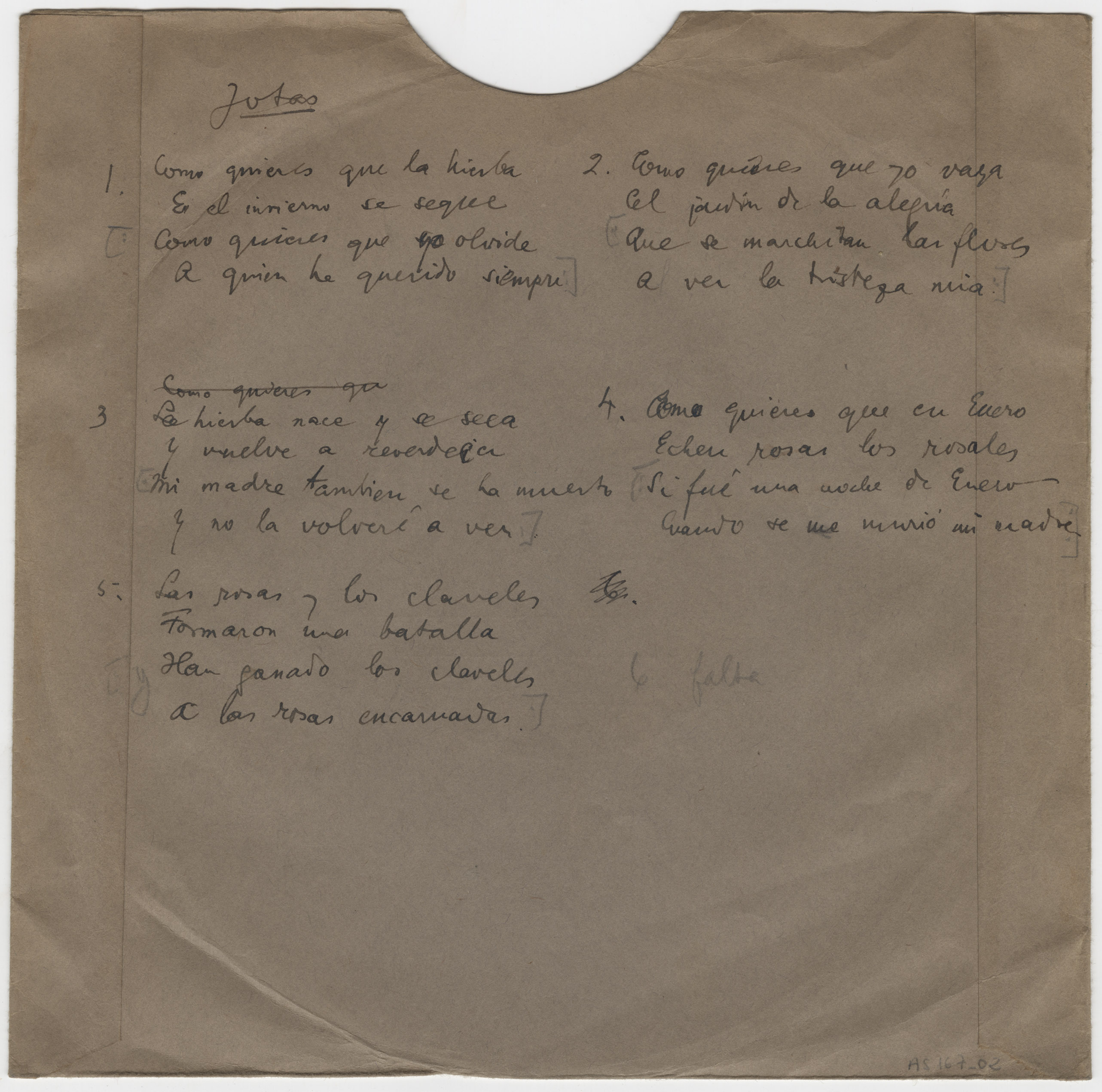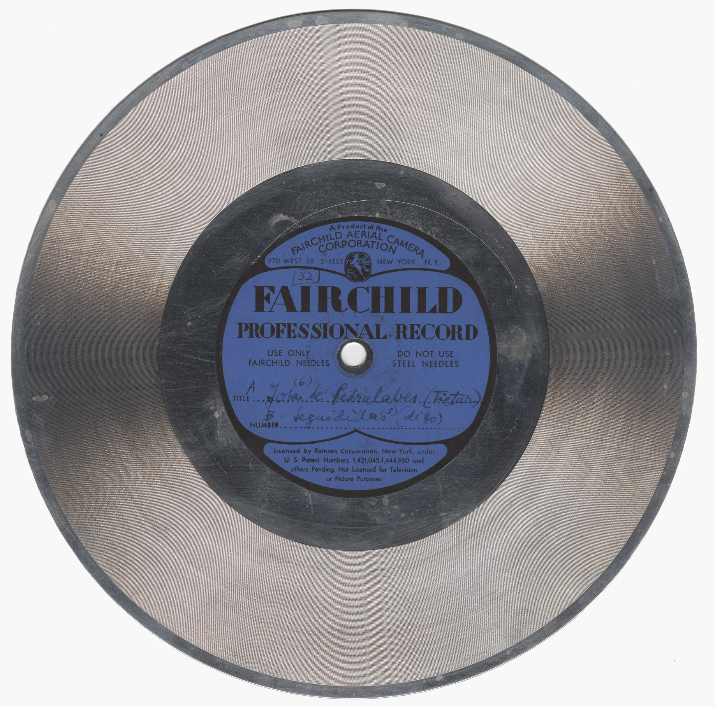 Descripción física: Disco de aluminio. Lugar y título anotado en la etiqueta del disco. En el sobre lleva manuscritas las letras de las canciones.