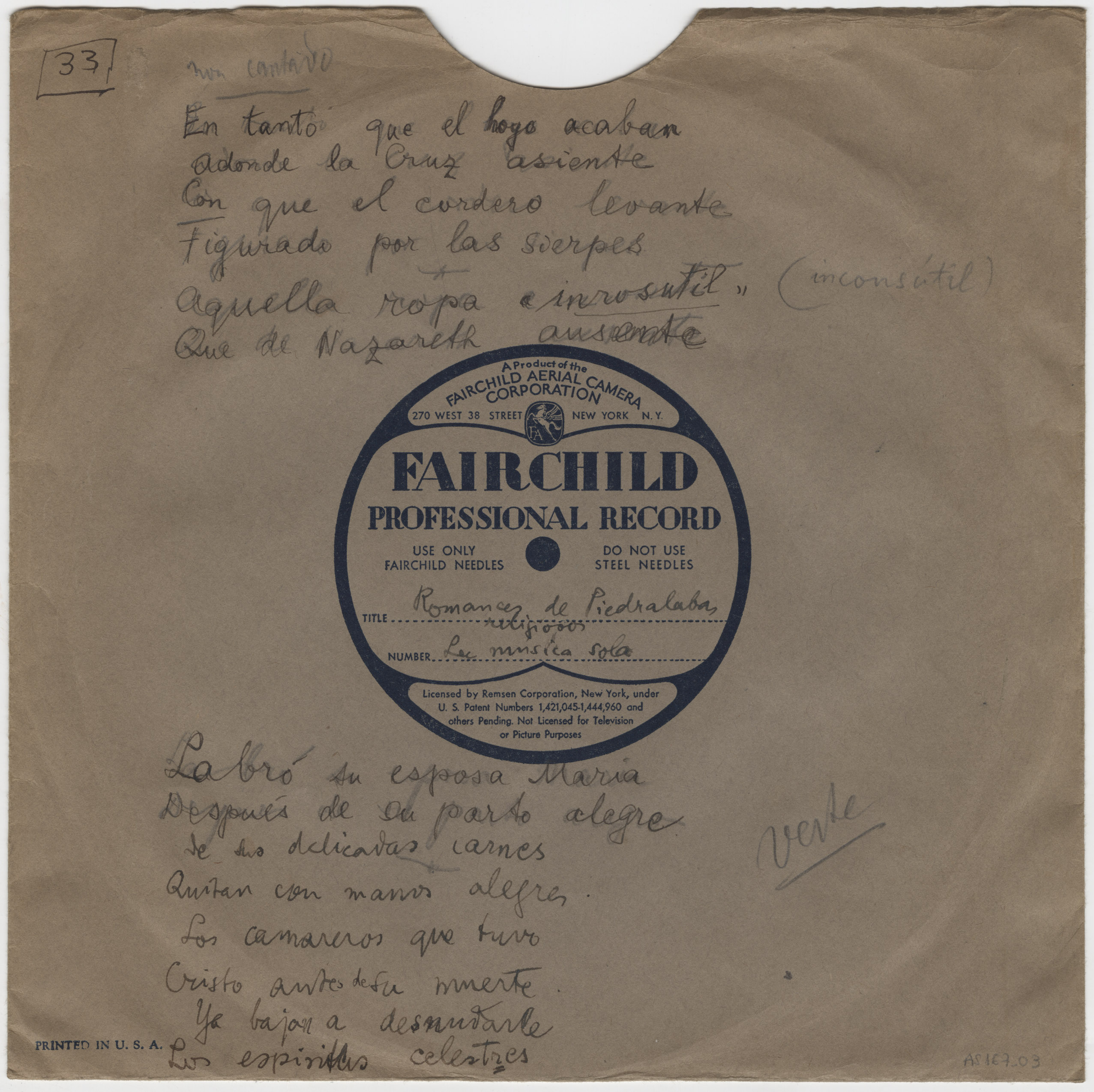 Marca comercial: Fairchild Professional Record (Fairchild Aereal Camera Corporation, New York).