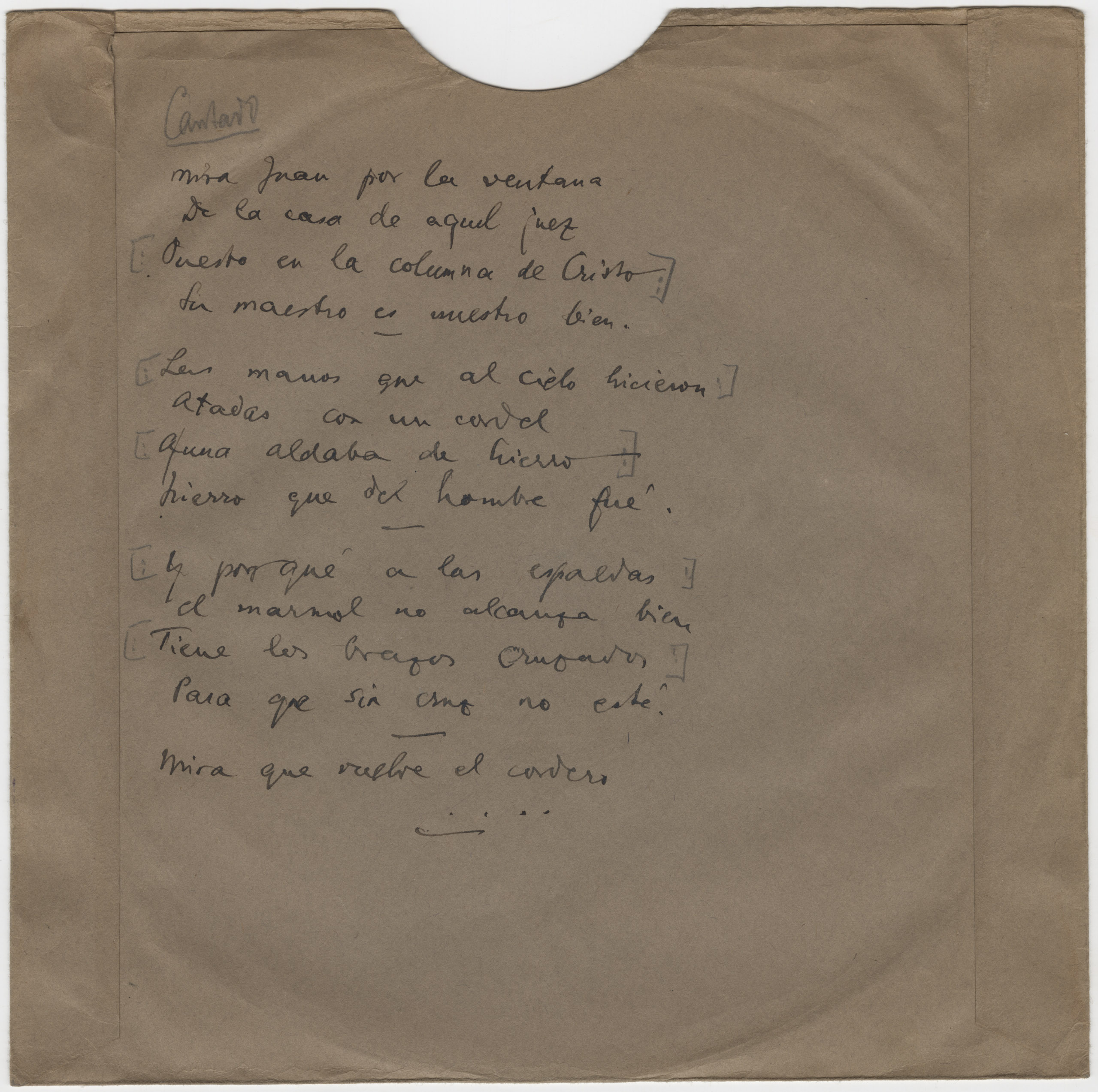 Descripción física: Disco de aluminio. En la pegatina del disco lleva manuscritos el lugar y el título: Romance religioso acompañado " Mira Juan por la ventana" . Música sola. laúd, guitarra, violín, cántaro. En el sobre lleva las letras manuscritas.