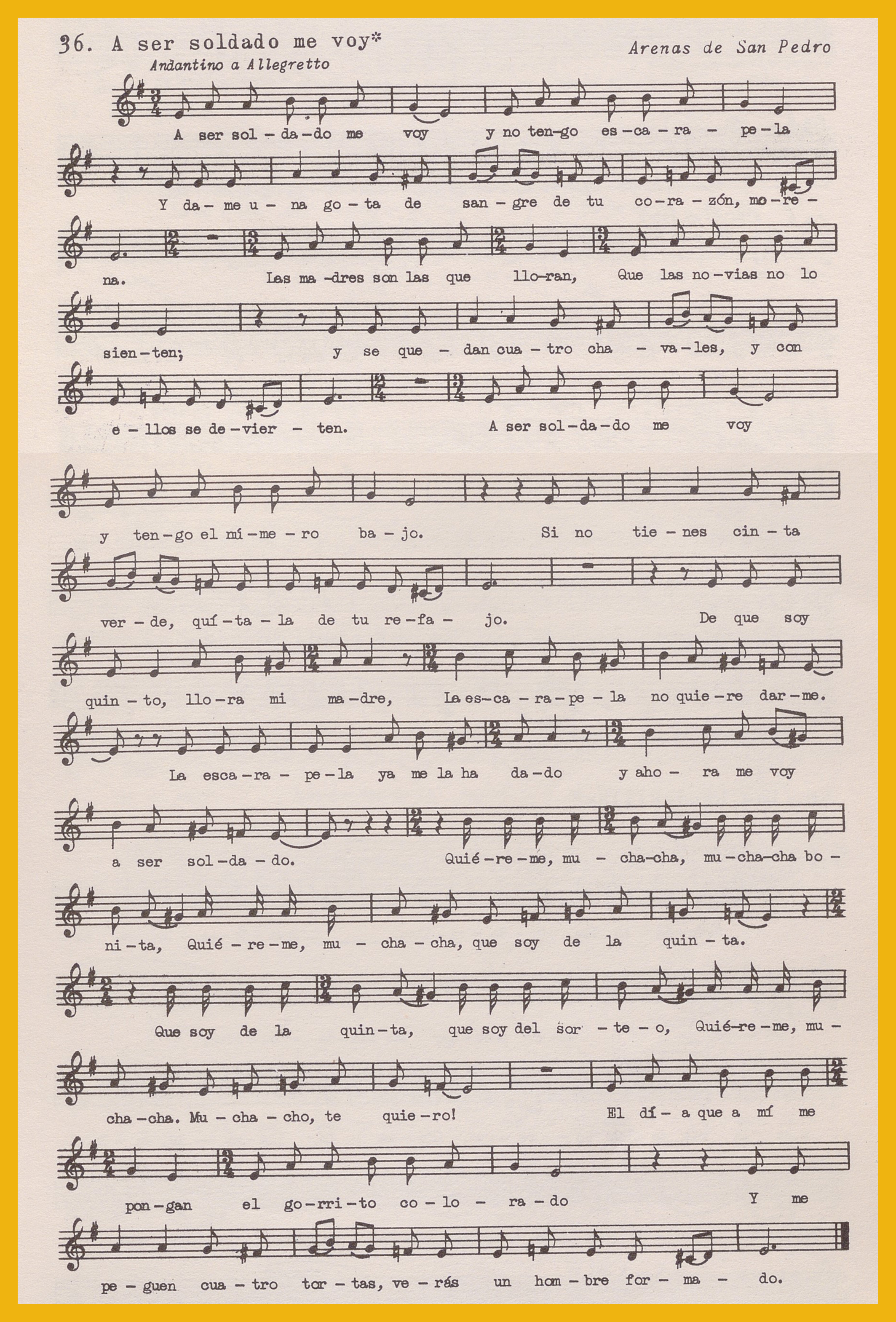 Ref. Partitura transcripción Kurt Schindler (1941): A. «La mi morena» (canción de Quintos) registro número nº 35. B. «A ser soldado de voy» (canción de Quintos), registro número nº 36