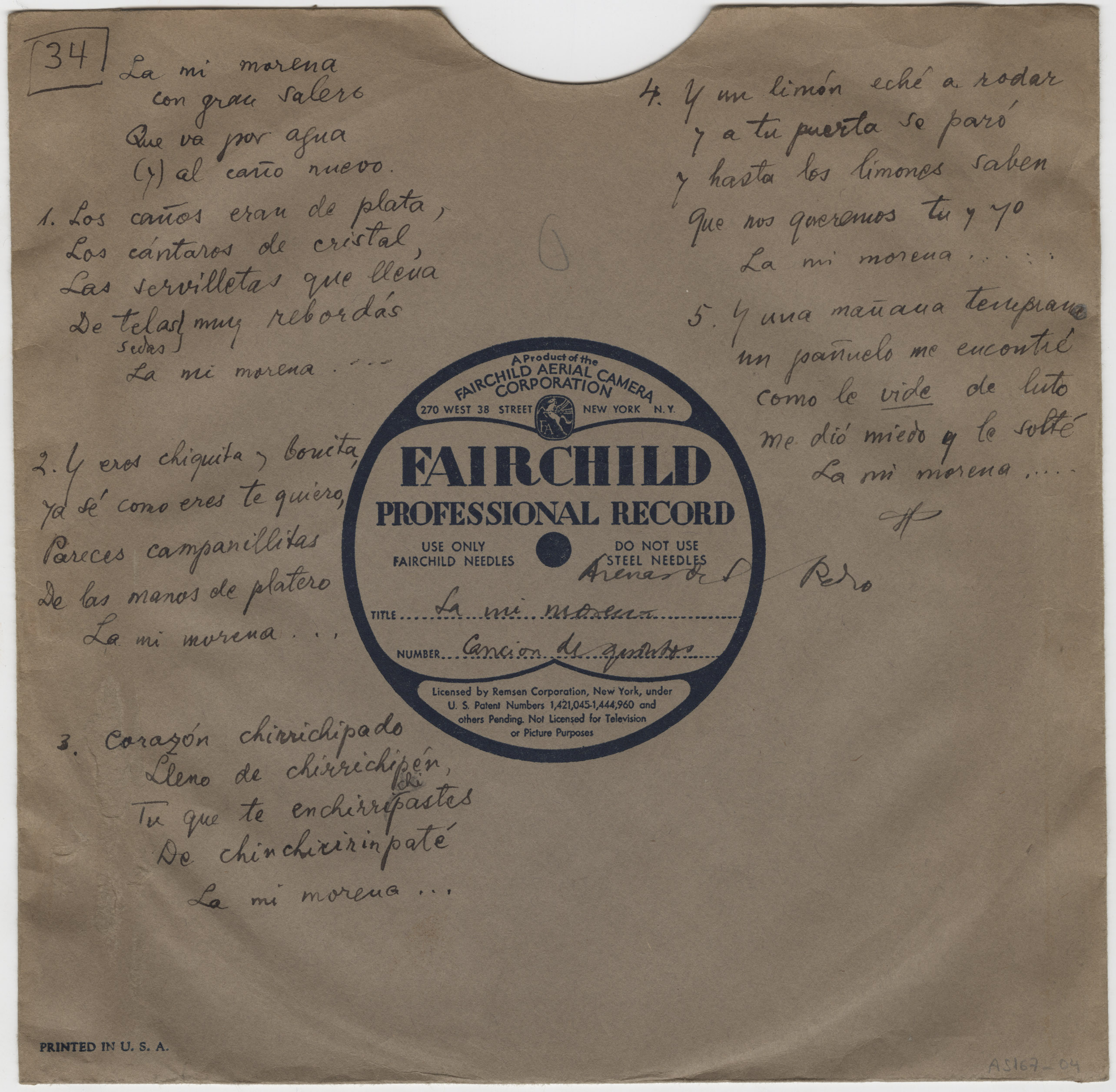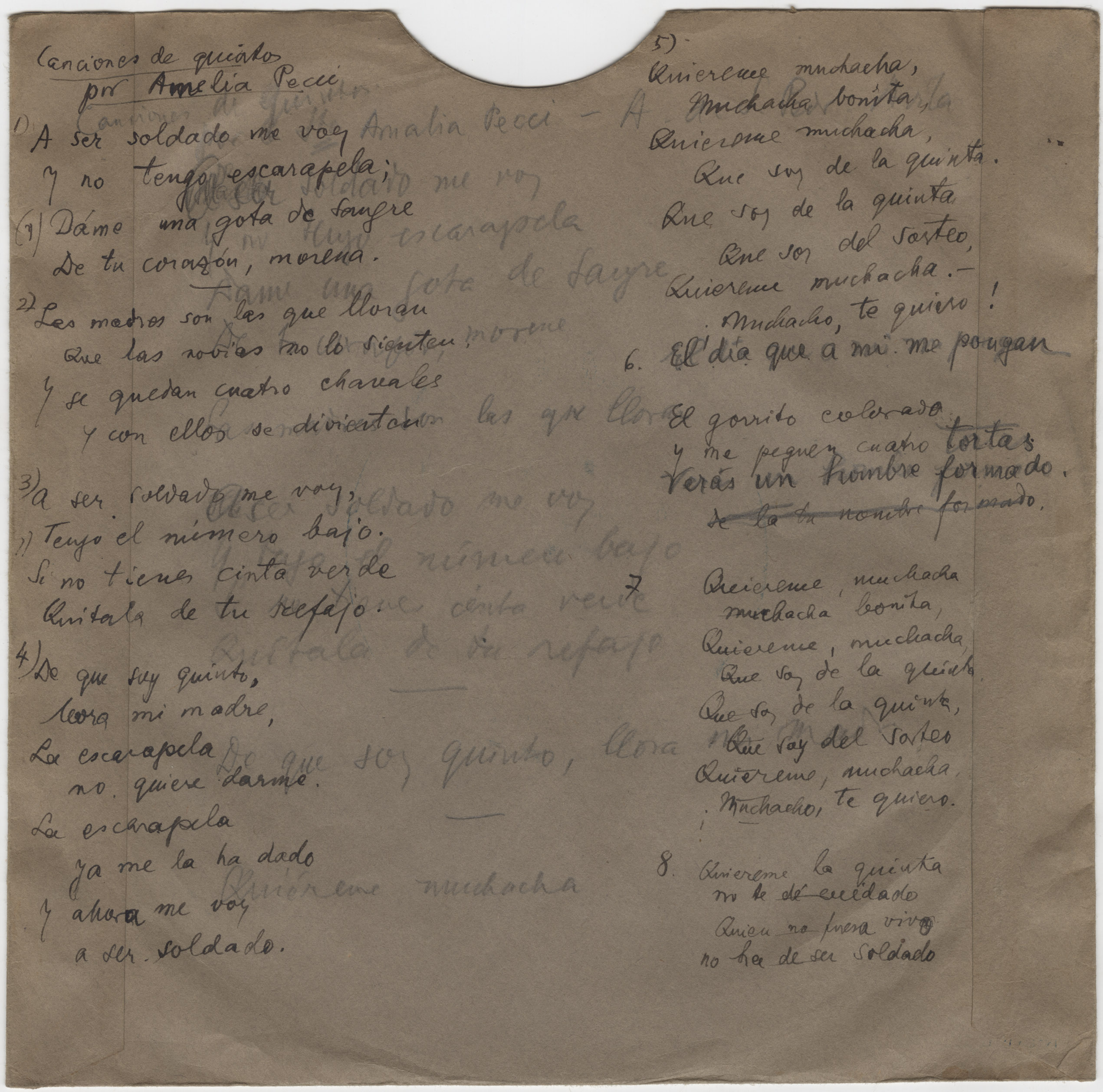 Descripción física: Disco de aluminio. En la etiqueta del disco lleva manuscritos el lugar, los títulos de las canciones y la intérprete, Amelia Pecci. En el sobre lleva las letras manuscritas.