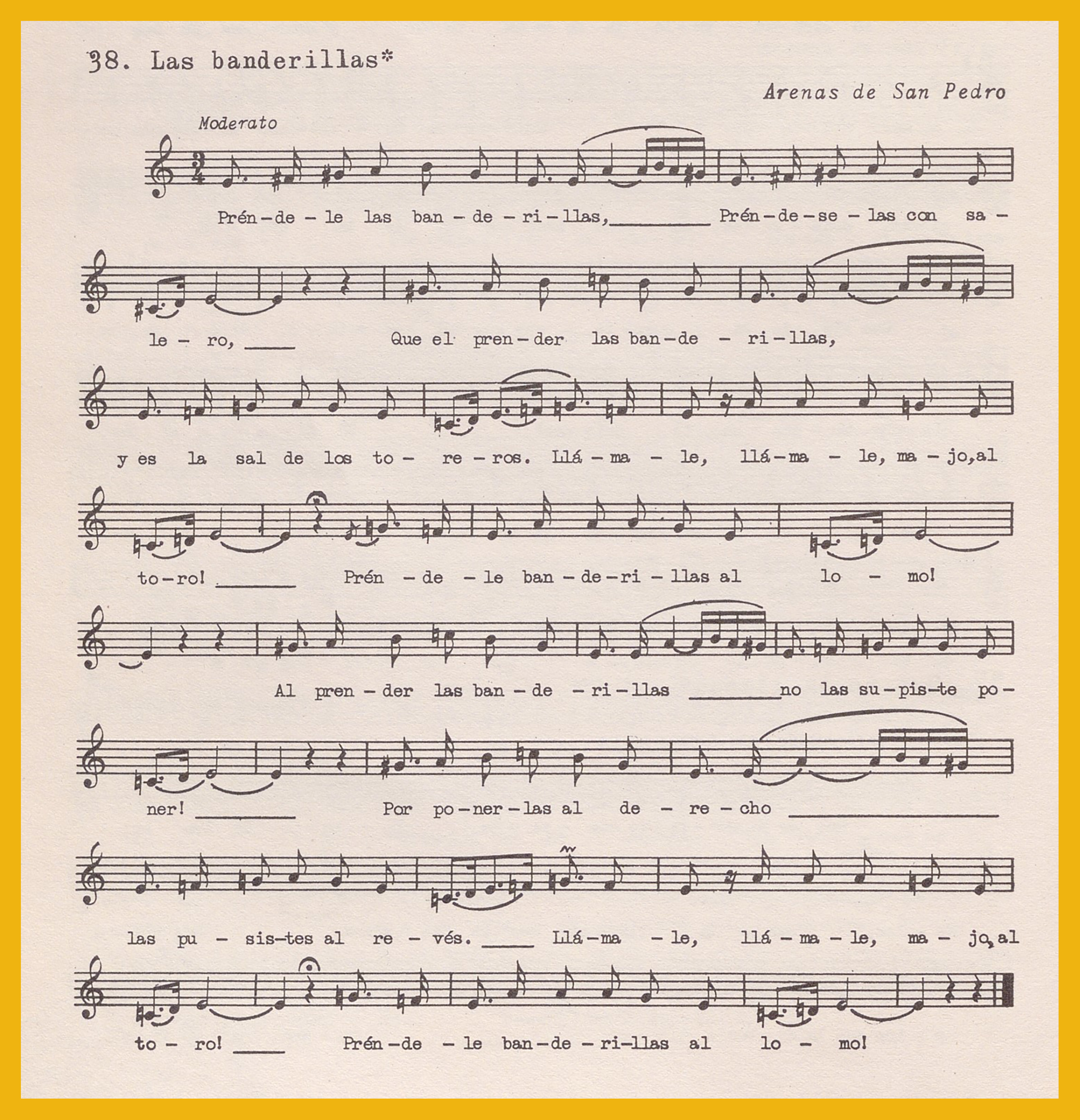 Ref. Partitura transcripción Kurt Schindler (1941): A. «Que no la llames», registro número nº 37. B. «Las banderillas» y «Asómate Juliana», registros número nº 38 y nº 39