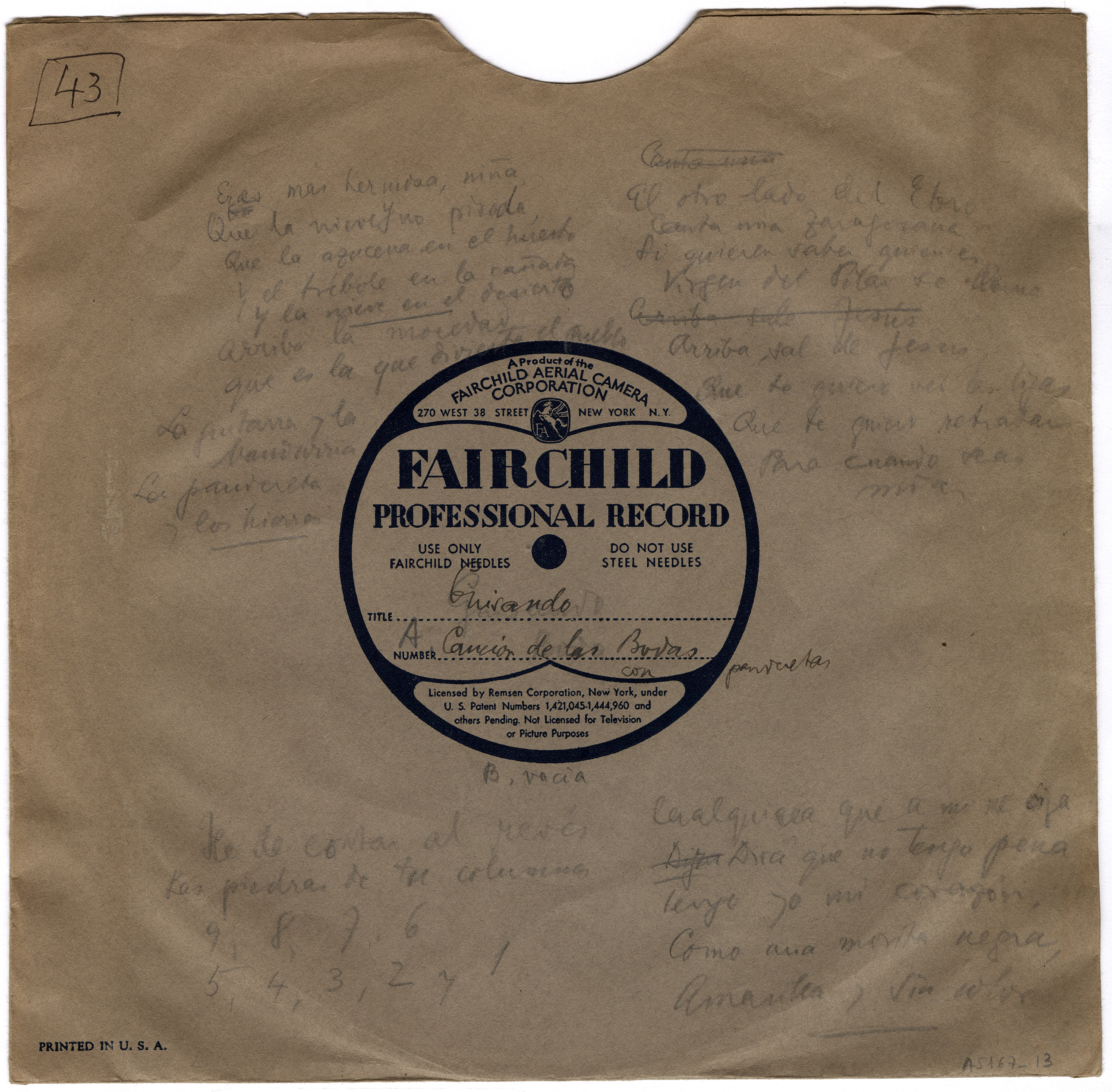Descripción física: Disco de aluminio. En la pegatina del disco lleva manuscritos el lugar y el título. En el sobre lleva manuscritas, además, varias estrofas de la canción y algunas notas a lápiz en el recto y la letra completa en tinta por el verso.