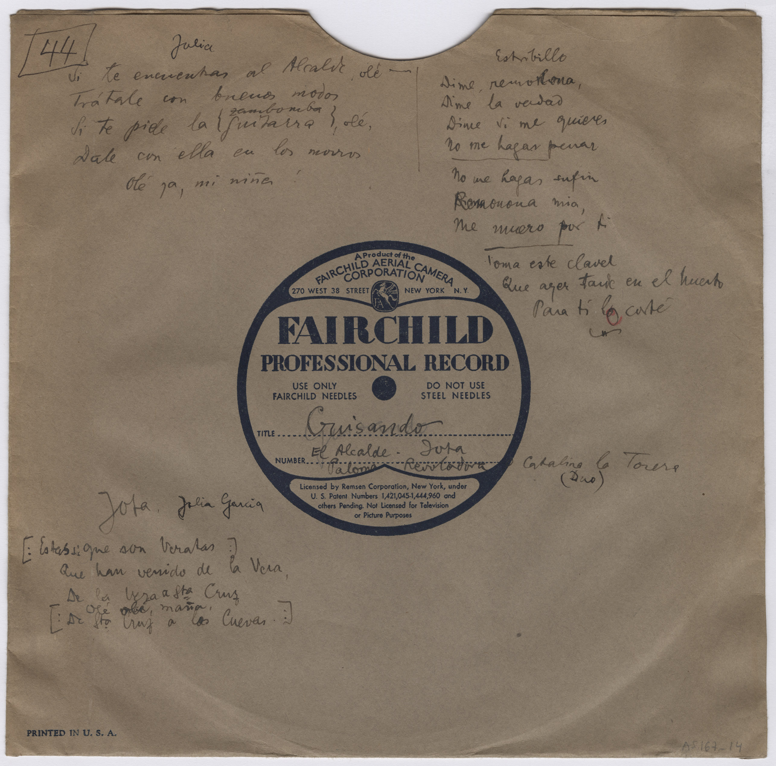 Descripción física: Disco de aluminio. En la pegatina del disco lleva manuscritos el lugar y los títulos de las canciones. En el sobre lleva manuscritas las letras de las canciones y las intérpretes: de las jotas, Julia García, y de Catalina la Torera, Julia García y Clara Pérez.