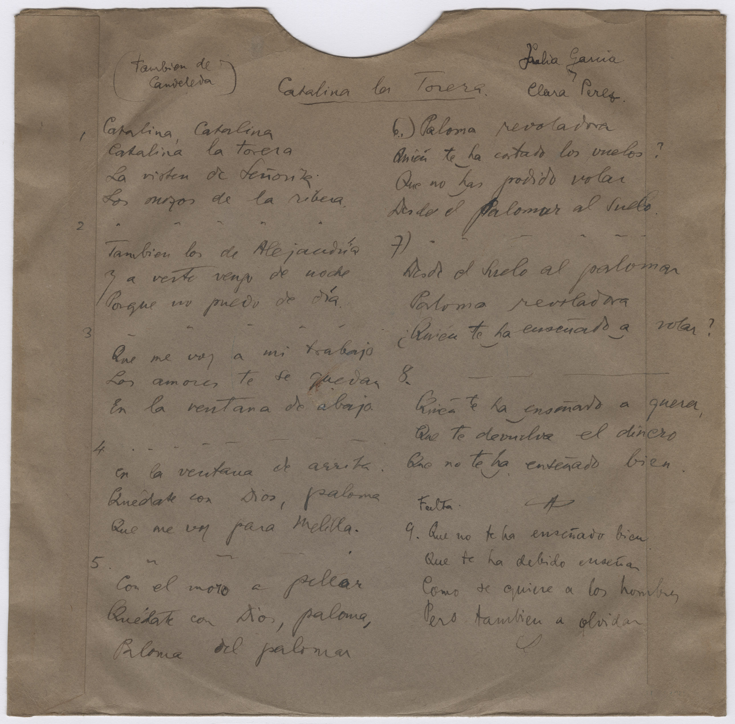 Paloma revoladora. Catalina la torera (Título procedente de la transcripción directa del disco)