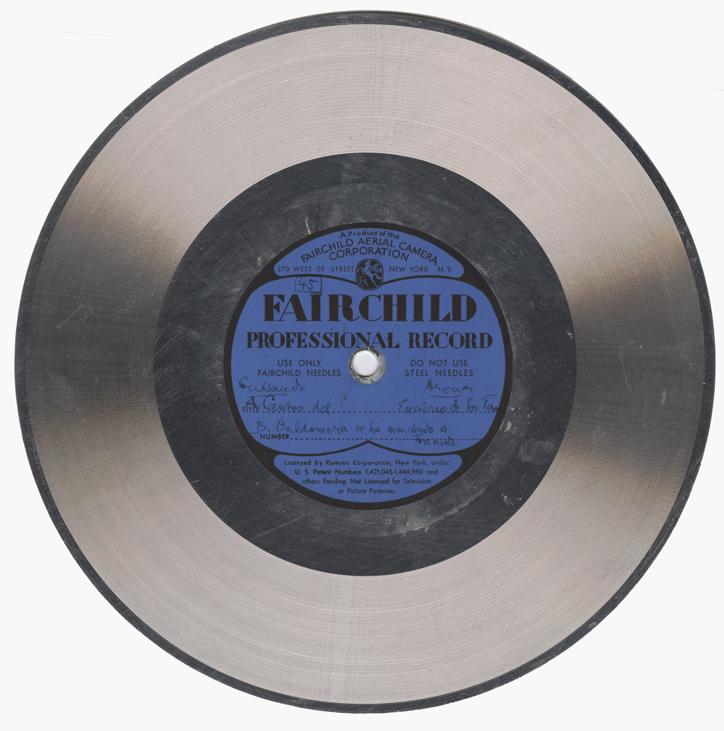 Descripción física: Disco de aluminio. En la pegatina del disco lleva manuscritos los lugares y los títulos de las canciones. En el sobre lleva manuscritas las letras de las canciones y las intérpretes: Julia y Adoración García.