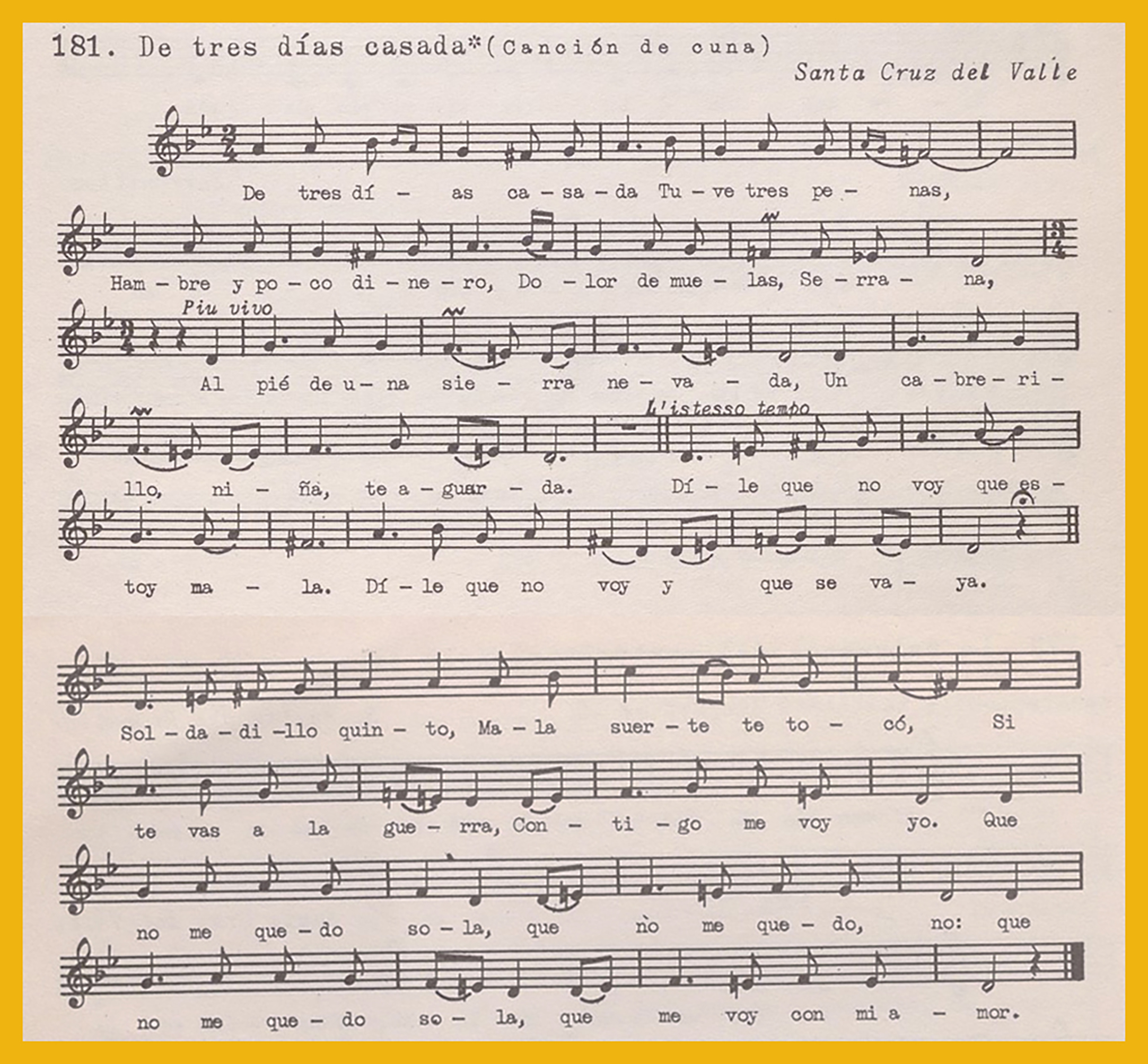 Ref. Partitura transcripción Kurt Schindler (1941): A. «De tres días de casada (Canción de cuna)», registro nº 181. B. «Una vez que te quise», registro nº 182