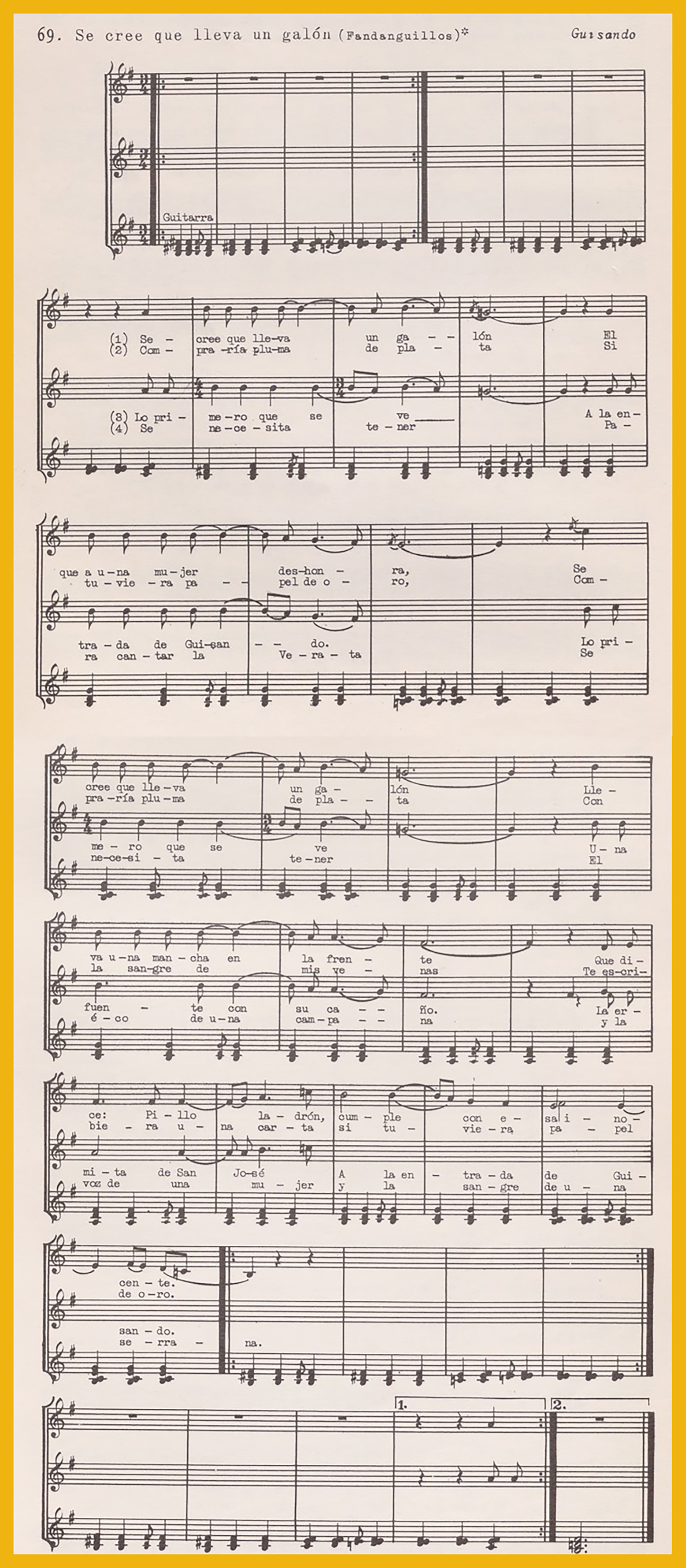 Ref. Partitura transcripción Kurt Schindler (1941): A. «Se cree que lleva un galón (fandanguillos)», registro nº 69. B. «Al olivo subí», registro nº 70