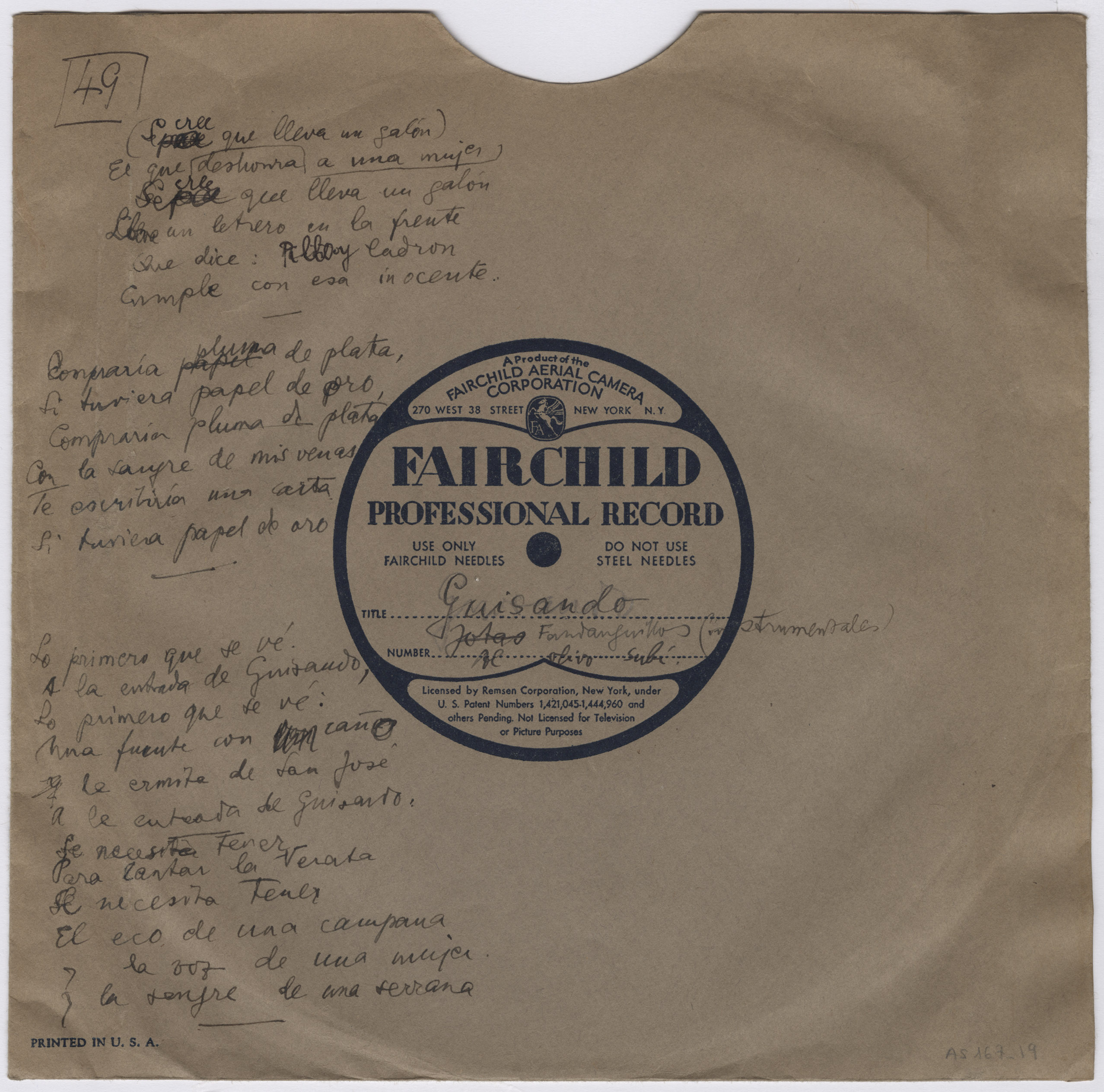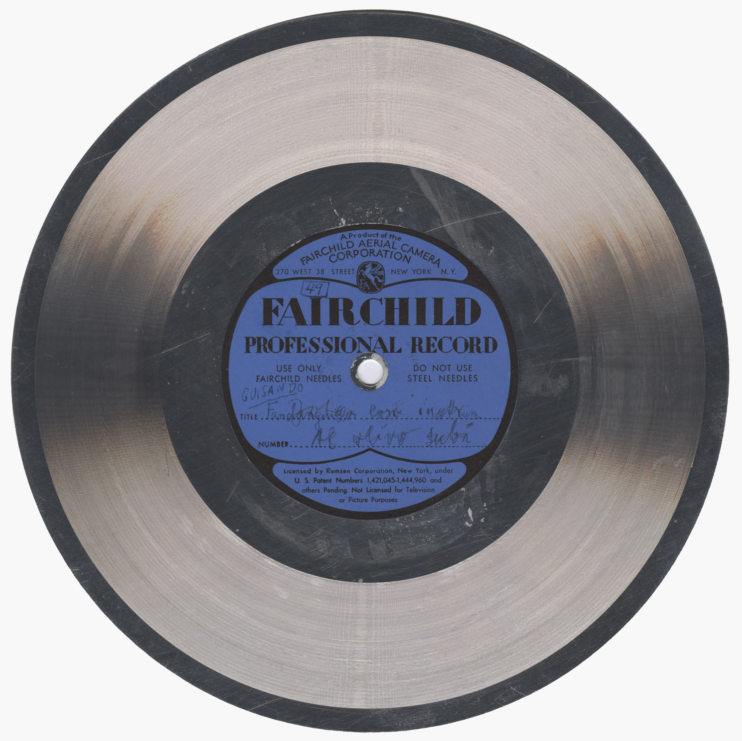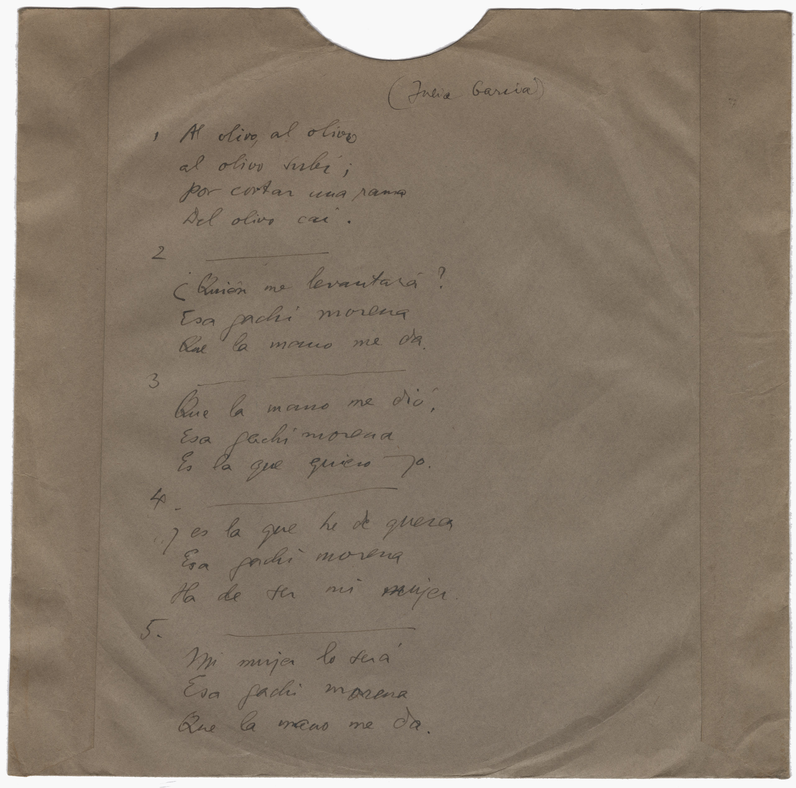 Descripción física: Disco de aluminio. En la etiqueta del disco lleva manuscrito el lugar y los títulos de las canciones. En el sobre, además, las letras de las canciones y la intérprete de " Al olivo subí" , Julia García.