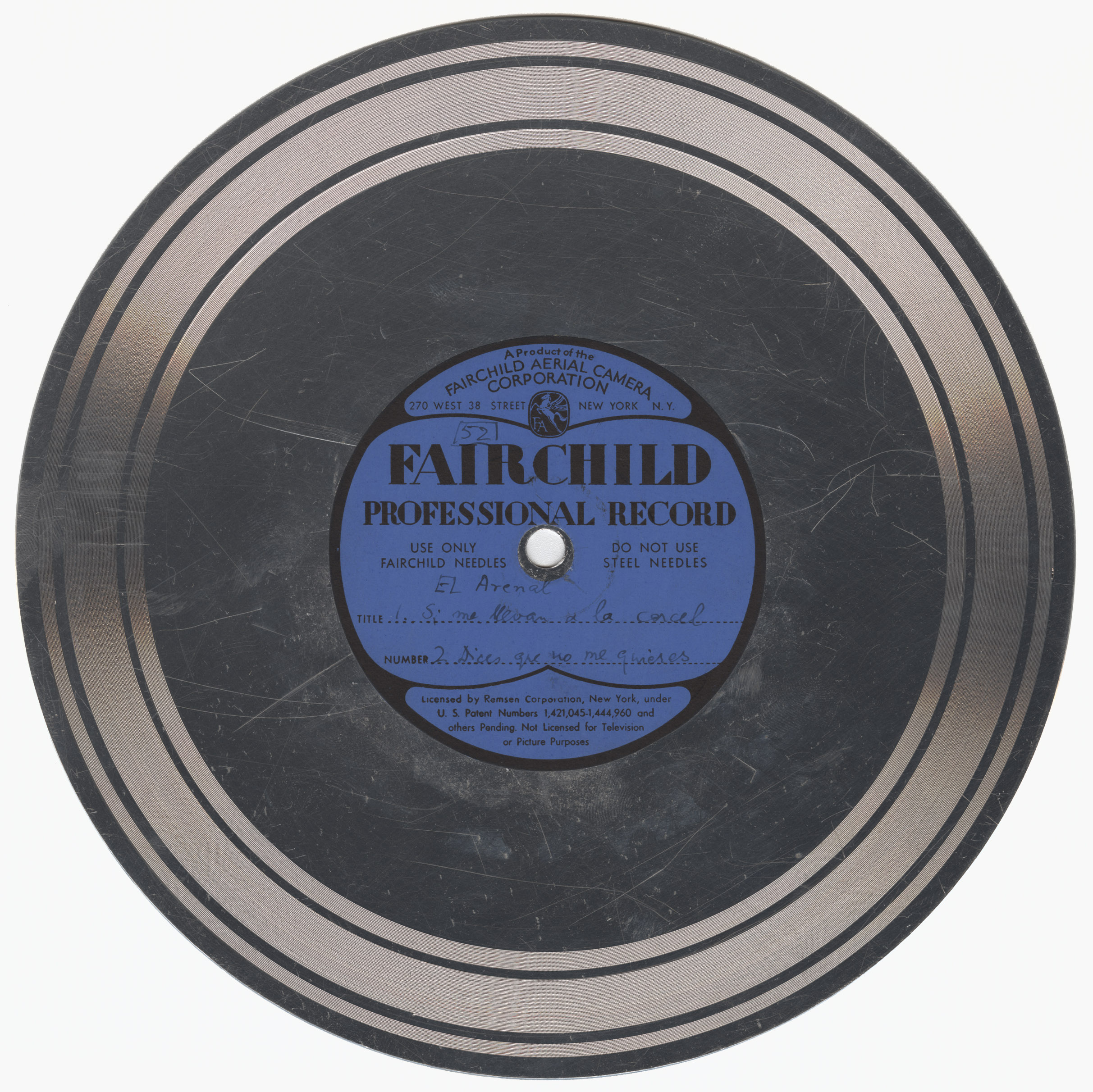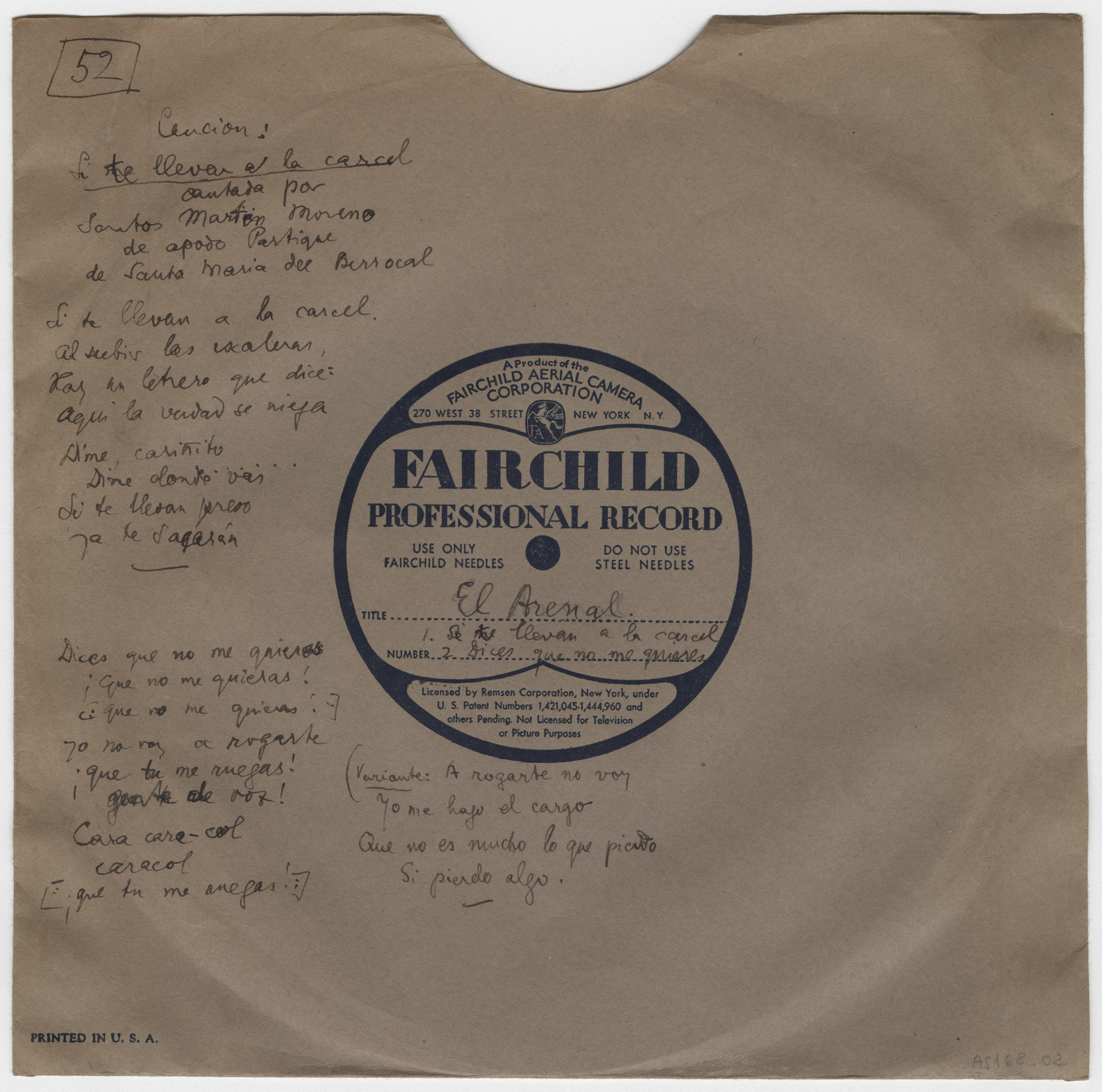 Descripción física: Disco de aluminio. En la etiqueta del disco lleva manuscrito el lugar y los títulos de las canciones. En el sobre lleva escritas, además, las letras de las canciones.