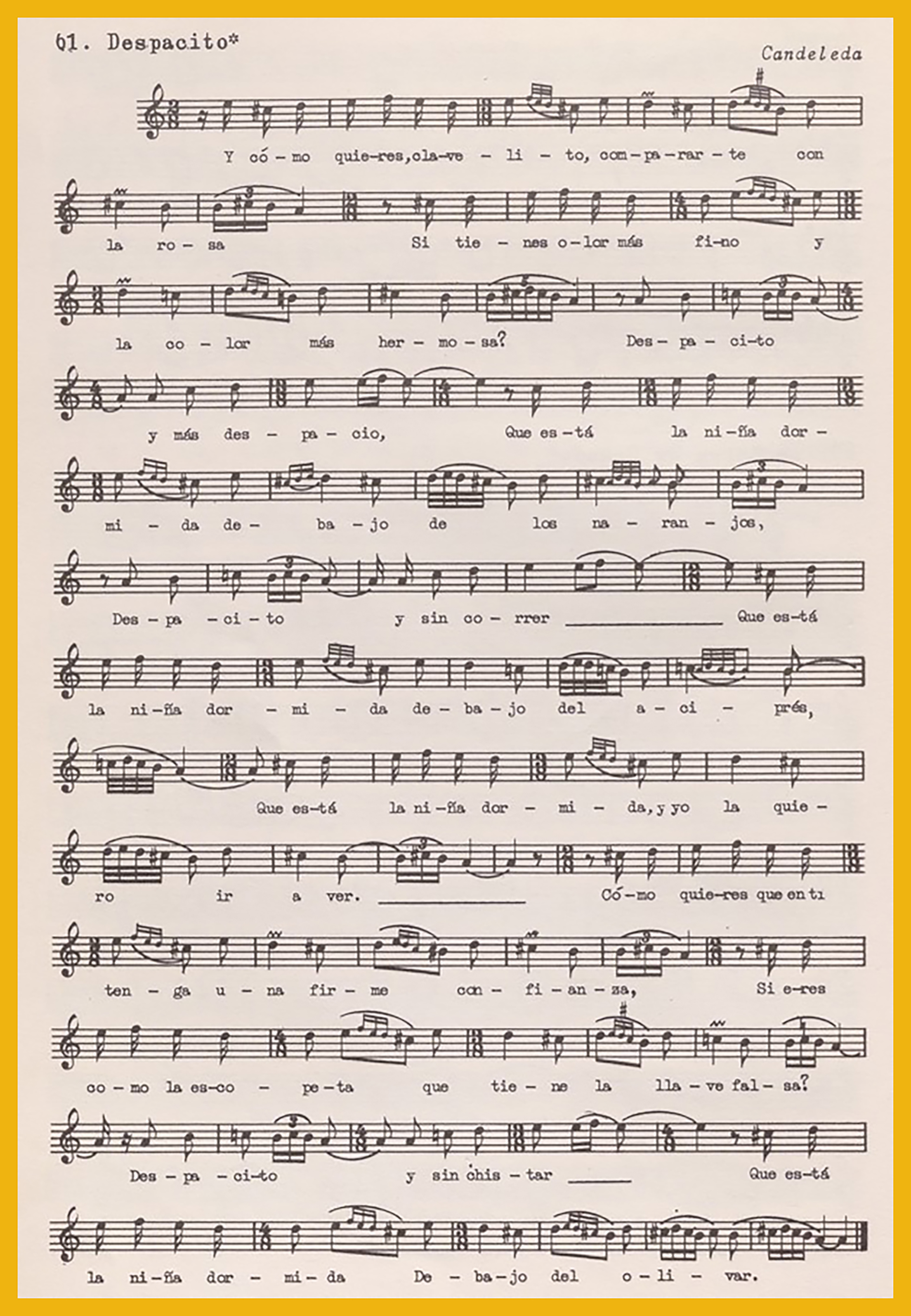 Ref. Partitura transcripción Kurt Schindler (1941): A. «La barca de Oranda» , registro nº 60. B. «Despacito», es la obra rotulada en el sobre como «Canción de los naranjos», registro nº 61