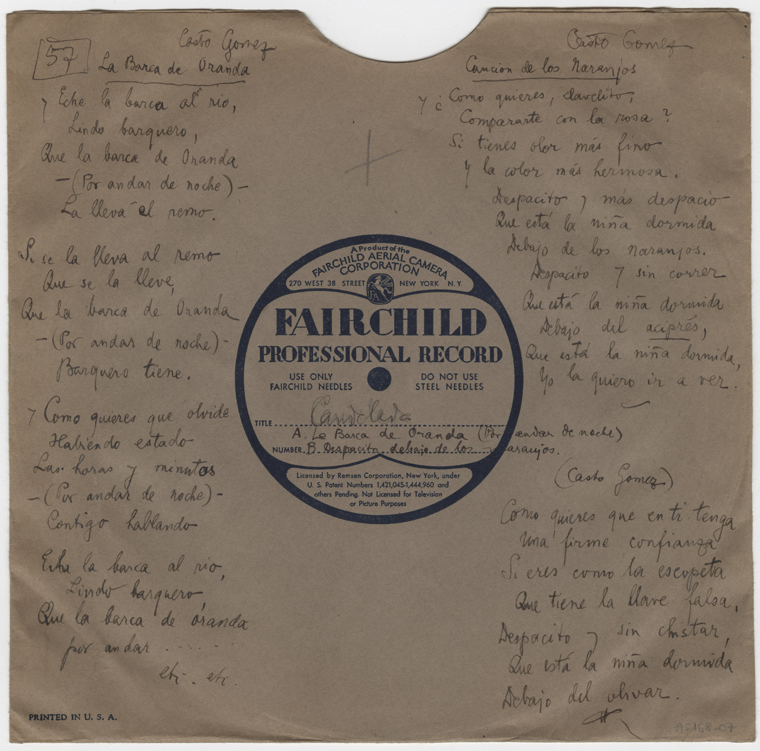 Descripción física: Disco de aluminio. En la etiqueta del disco llevas manuscritos el lugar y los títulos de las canciones. En el sobre lleva escritas las letras y el intérprete de ambas, Casto Gómez.