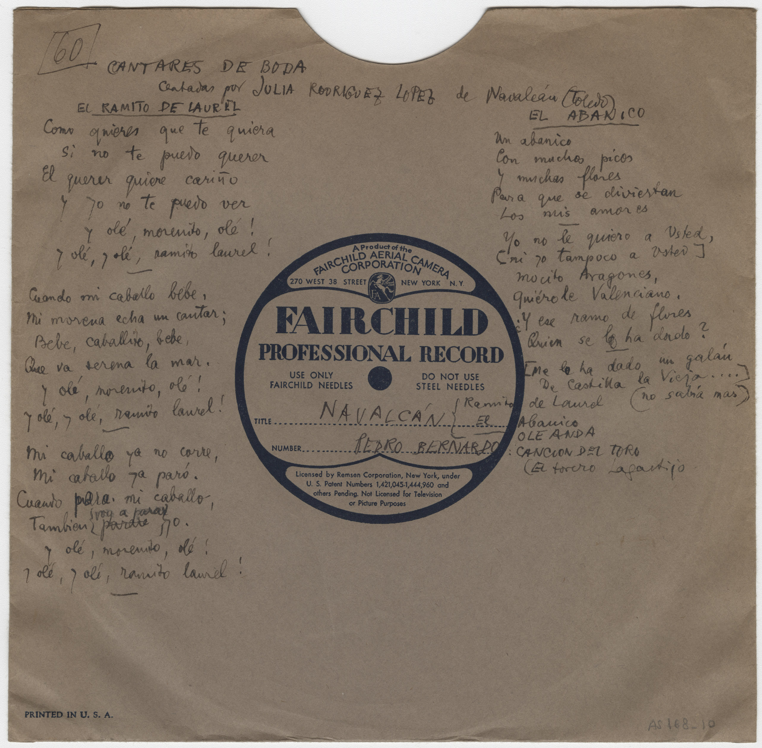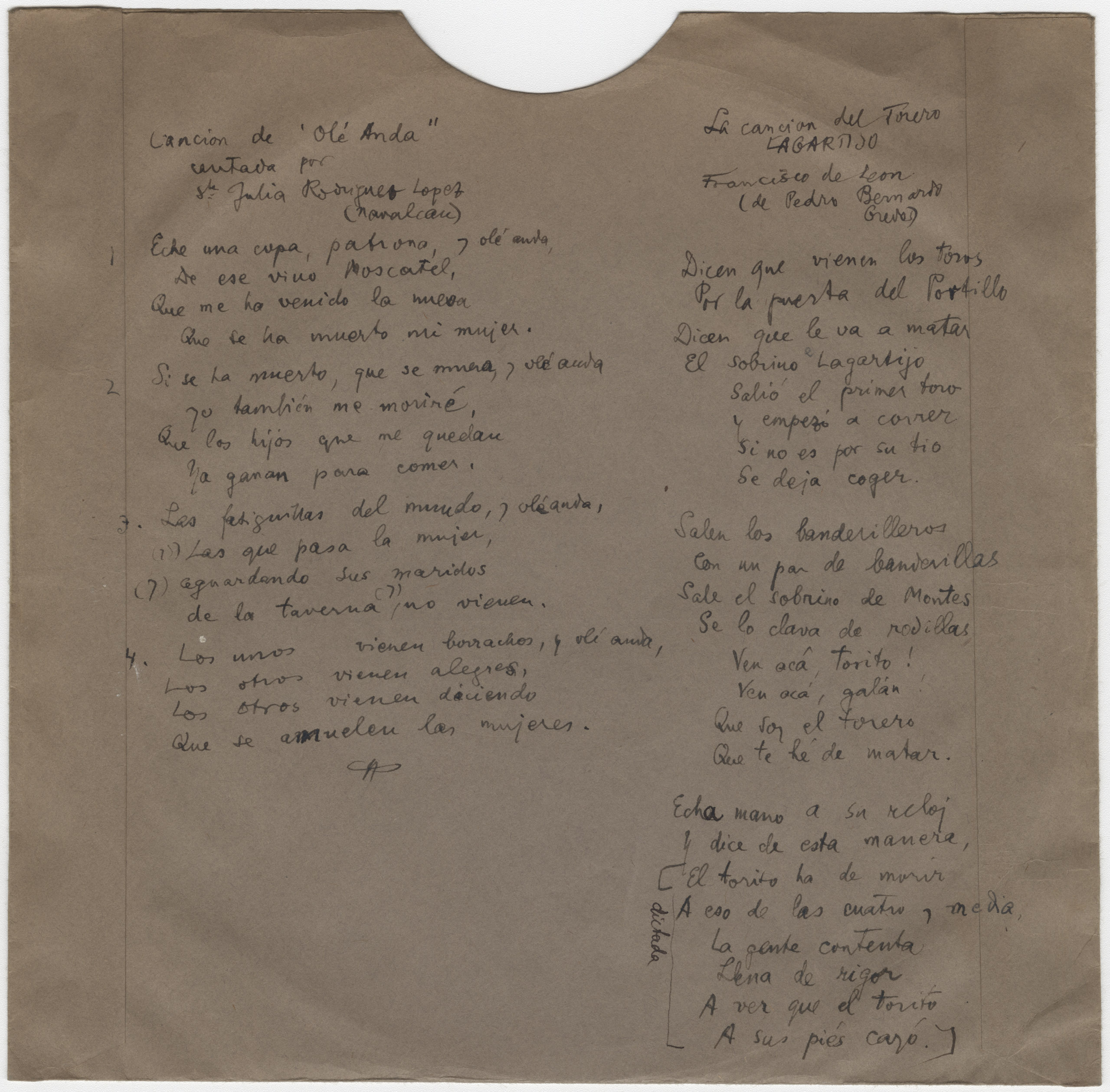 Descripción física: Disco de aluminio. En la etiqueta del disco lleva manuscritos los lugares y los títulos de las canciones. En el sobre lleva escritas las letras de las canciones y los intérpretes, Julia Rodríguez López y Francisco de León.