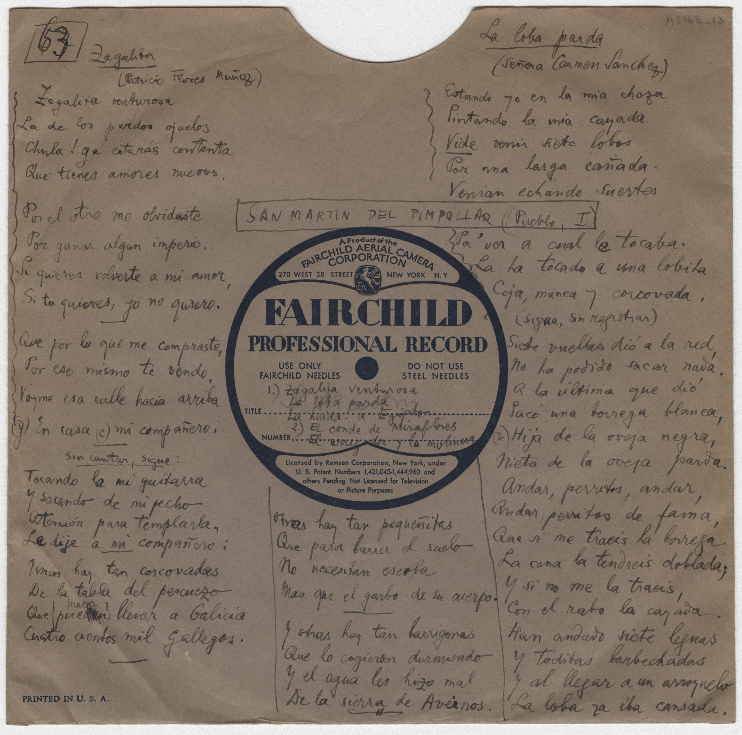Descripción física: Disco de aluminio. En la etiqueta del disco lleva manuscritos el lugar y los títulos de las canciones. En el sobre lleva escritas las letras completas de las canciones y los intérpretes, Patricio Flores Muñoz, Carmen Sánchez y Lucía Calvo. Va acompañado de una cuartilla con las letras de " El Conde Flor, Miraflores, Romance con Arrabel" otros versos de la " La Huida a Egipto" y variantes de " El corregidor y la Molinera" .