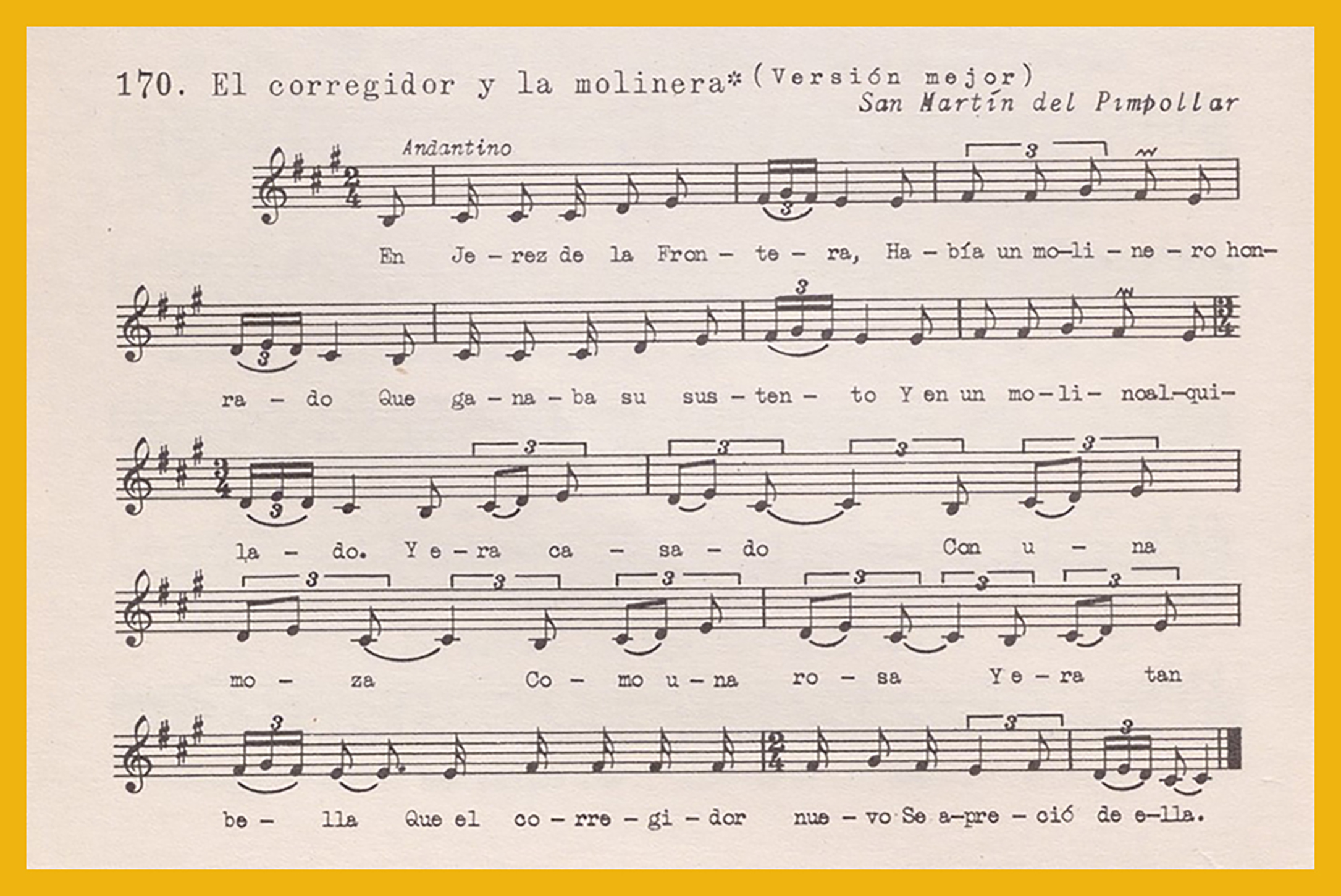 Ref. Partitura transcripción Kurt Schindler (1941): A. «Zagalita venturosa», registro nº 165. «La loba parda (romance)», registro nº 166. «Huida a Egipto», registro nº 167. B. «El Conde Flor», romance con arrabel (sic), registro nº 168. «El corregidor y la molinera», registro 169. «El corregidor y la molinera (versión mejor)», registro nº 170