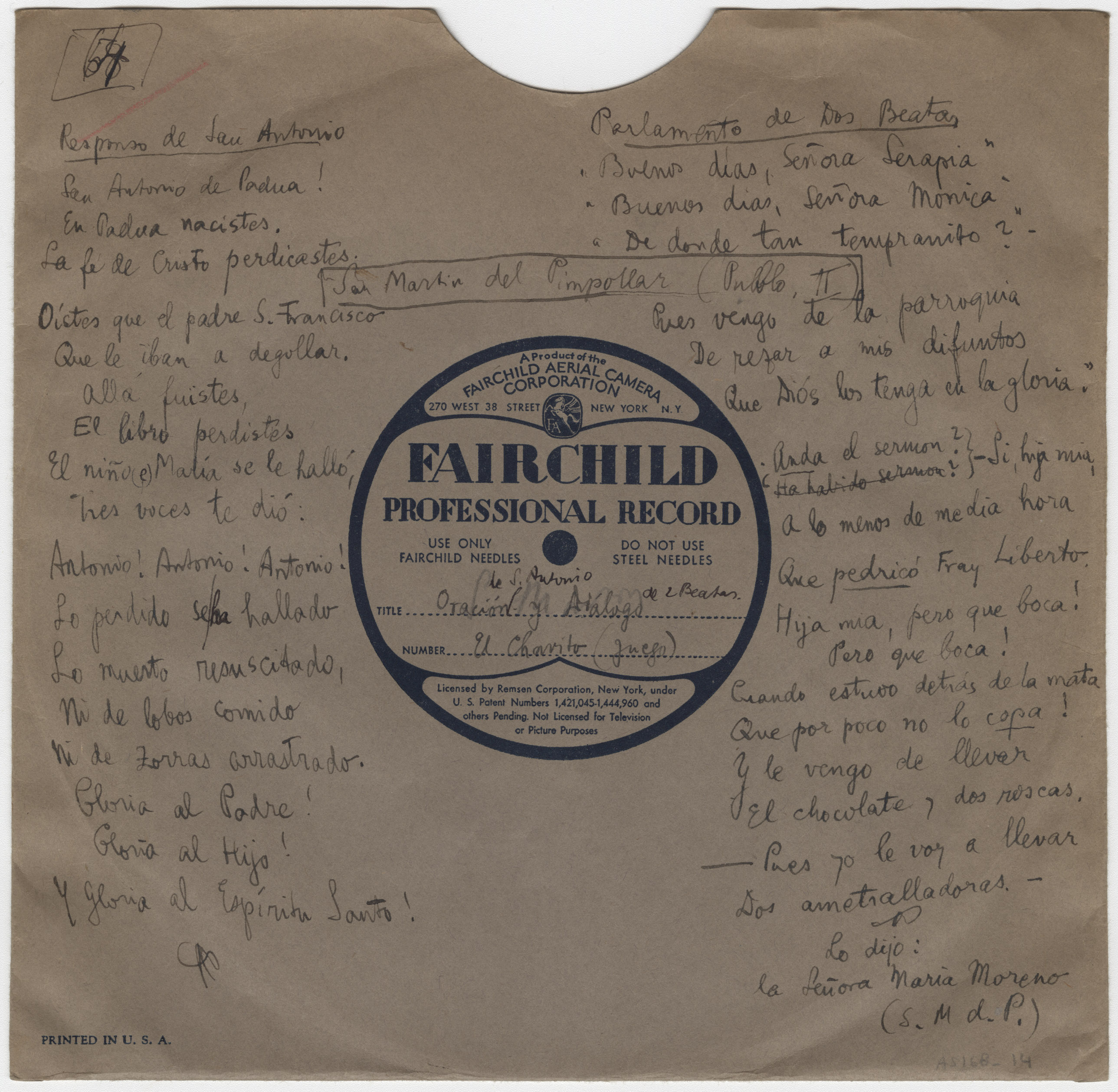 Descripción física: Disco de aluminio. En la etiqueta del disco lleva manuscritos el lugar y los títulos de las canciones, y en el sobre lleva las letras de las canciones: Responso de San Antonio, Parlamento de Dos Beatas y la Canción del Chavito. En la última se indica que solo la sabe la Señora María [sic] Moreno.