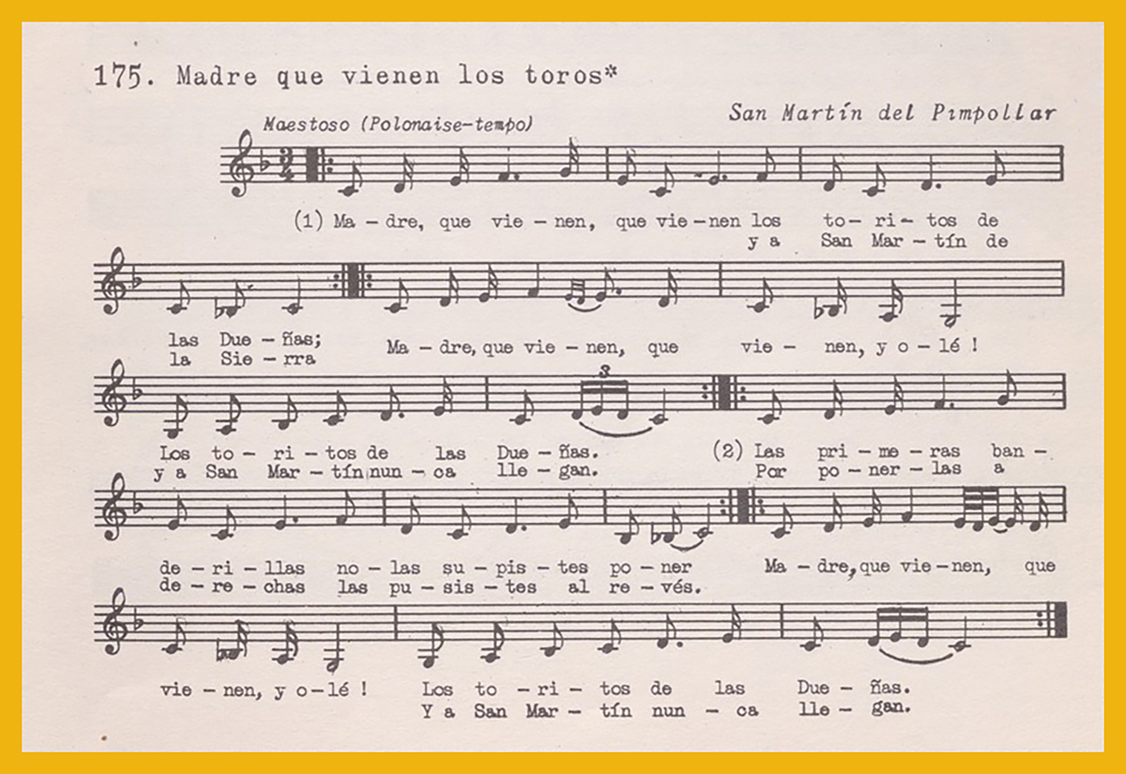 Ref. Partitura transcripción Kurt Schindler (1941): A. «Ya está el Torito en la plaza», registro nº 173. B. «Madre que vienen los toros», registro nº 175. «Ya está el Torito en la plaza (segunda tonada)», registro nº 174