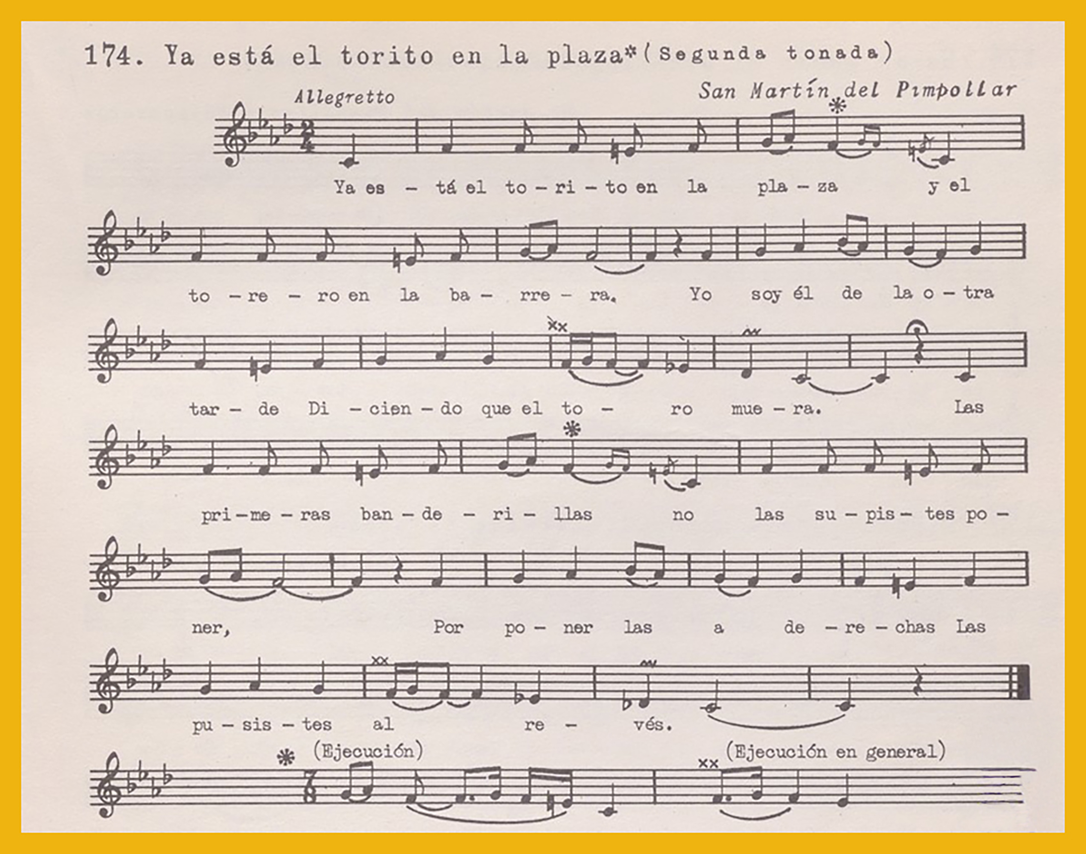 Ref. Partitura transcripción Kurt Schindler (1941): A. «Ya está el Torito en la plaza», registro nº 173. B. «Madre que vienen los toros», registro nº 175. «Ya está el Torito en la plaza (segunda tonada)», registro nº 174