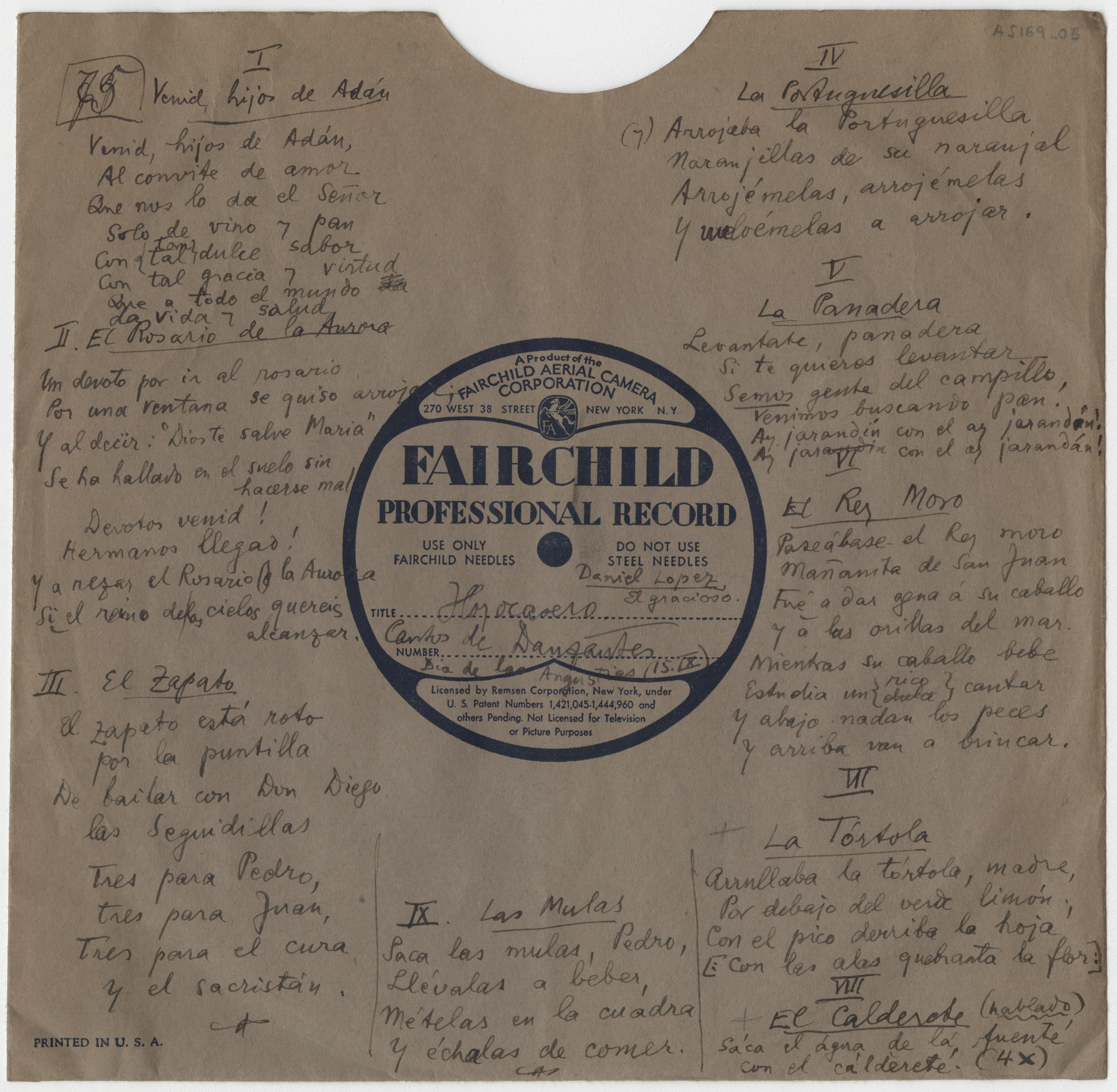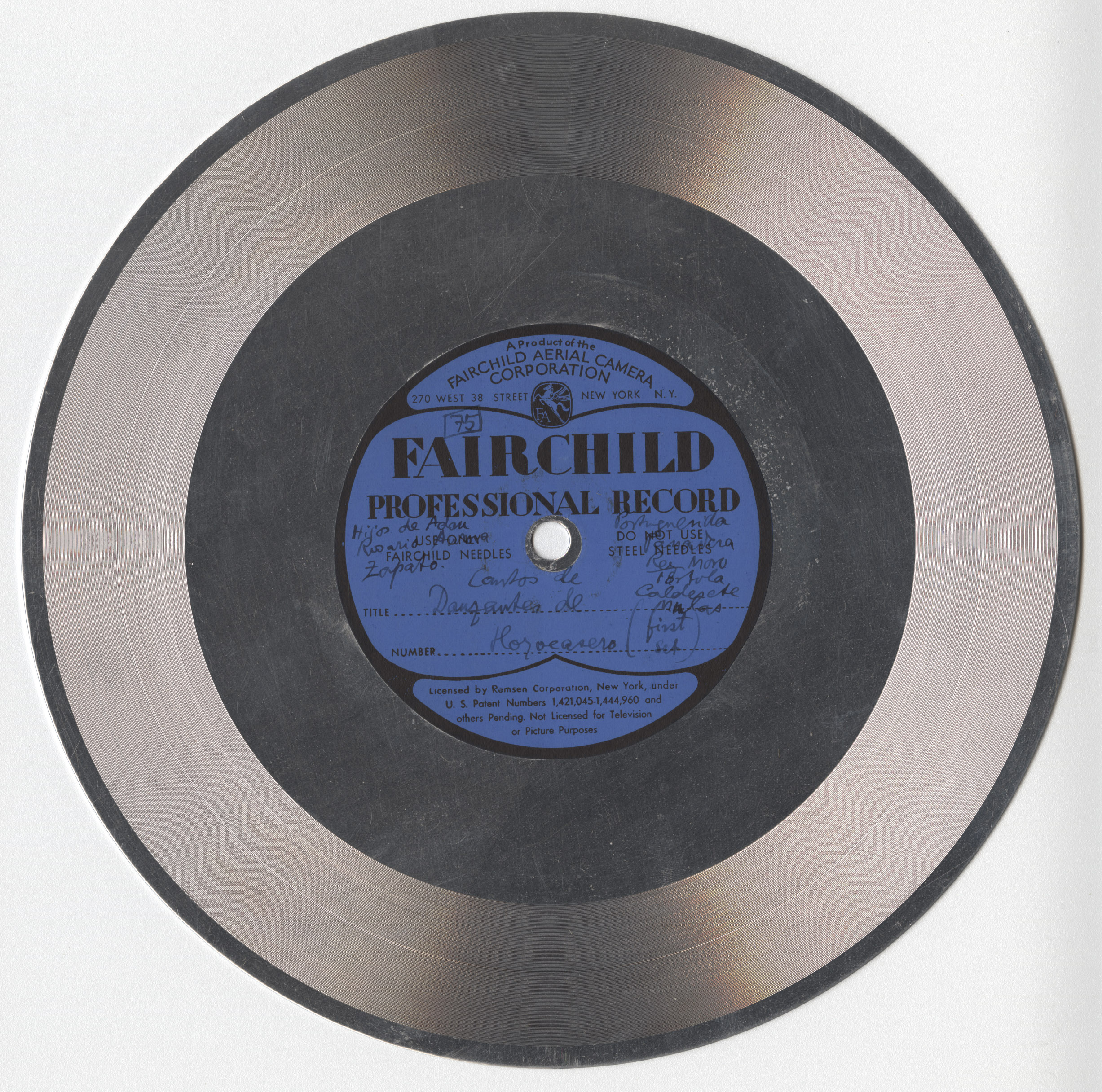Descripción física: Disco de aluminio. En la etiqueta del disco lleva manuscrito lugar y los títulos. En el sobre lleva escritas las letras de los cantos y el intérprete, Daniel López " El gracioso" .