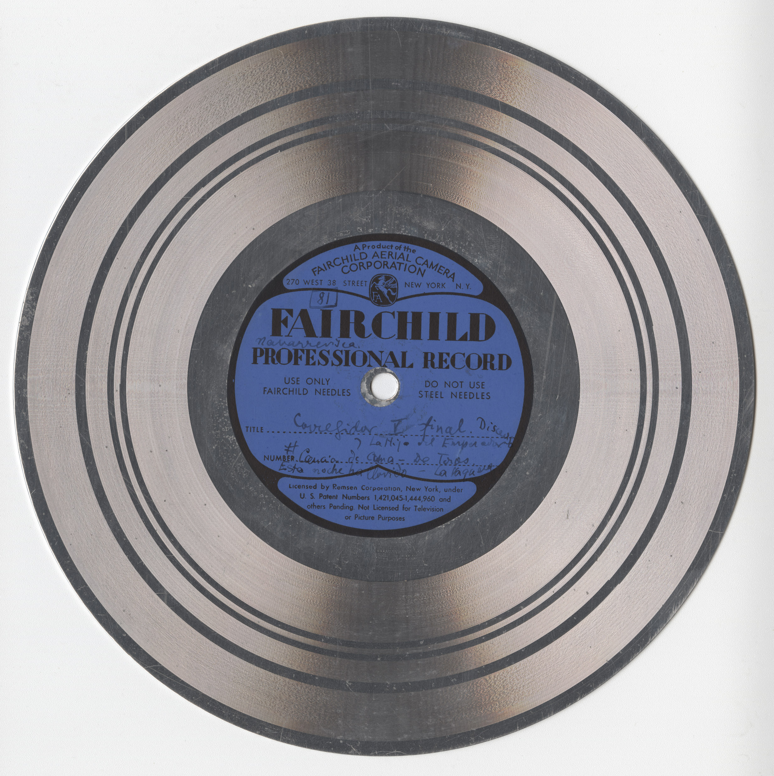 Marca comercial: Fairchild Professional Record (Fairchild Aereal Camera Corporation, New York).