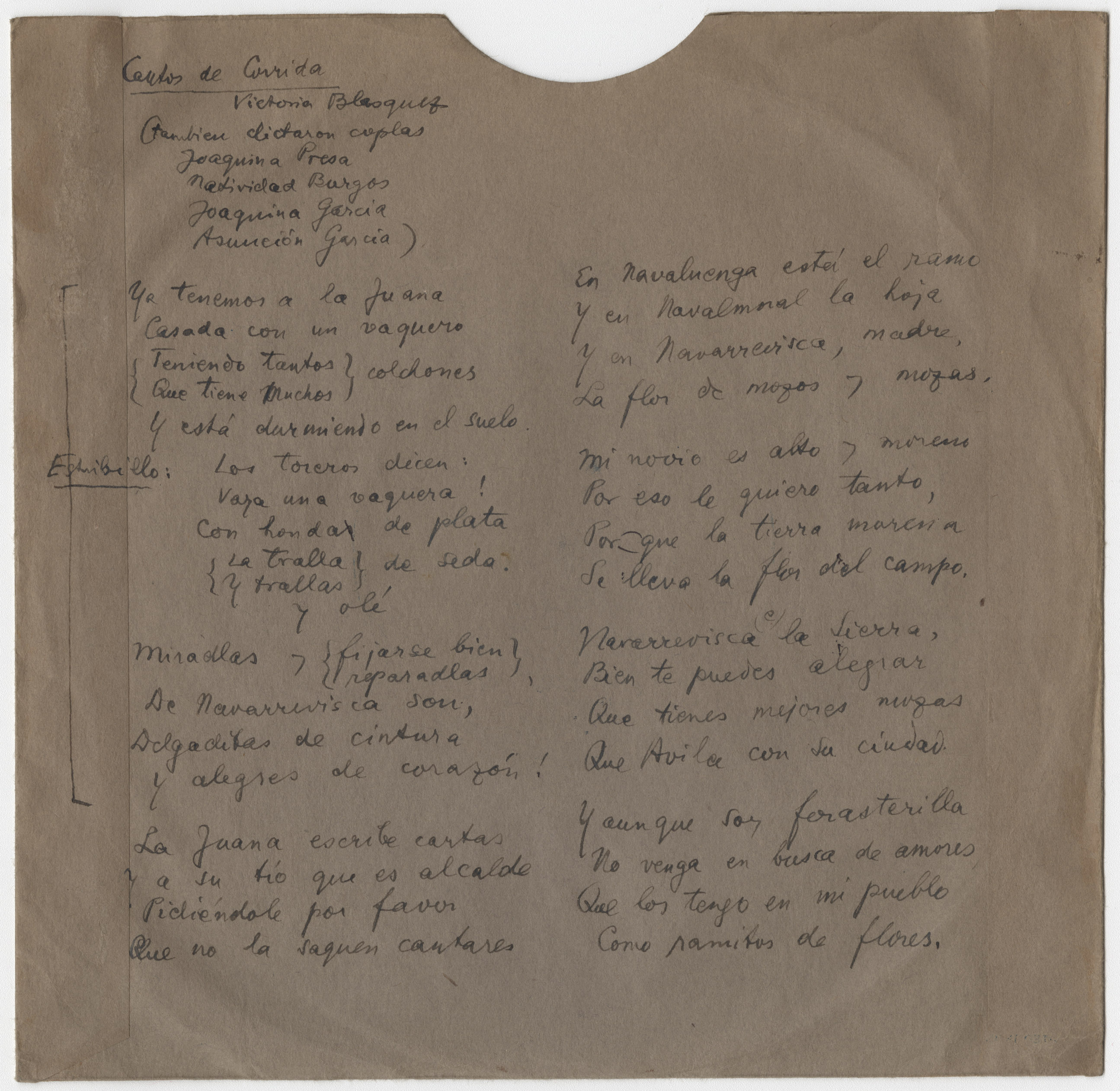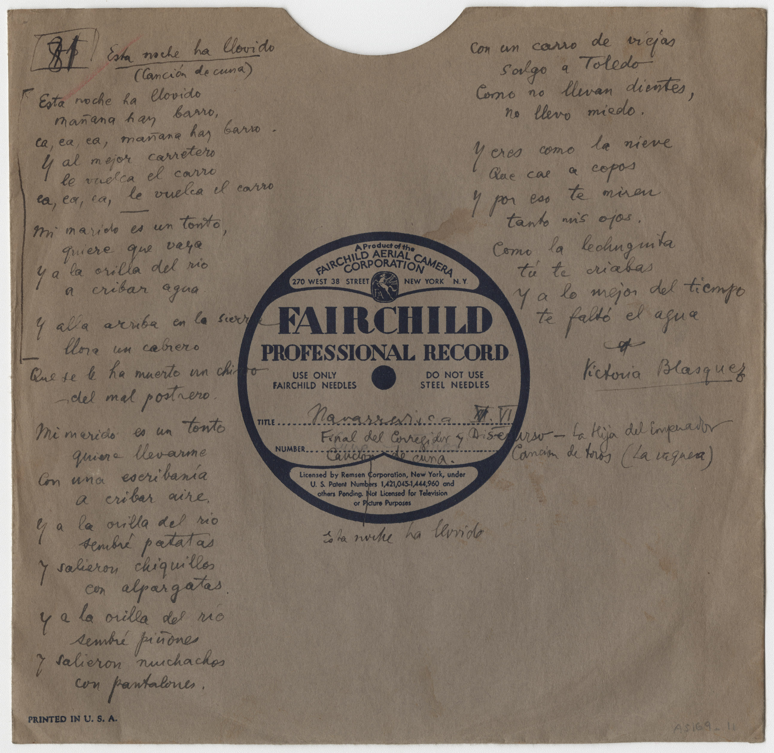 Descripción física: Disco de aluminio. En la etiqueta del disco lleva manuscrito el lugar y los títulos de las canciones, y en el sobre la letra de las canciones y la intérprete de las dos últimas, Victoria Blázquez. La letra correspondiente al final del Corregidor está recogida en la carátula del disco n.º 80. Va acompañado de una cuartilla con la letra de " La hija el emperador de Roma" .