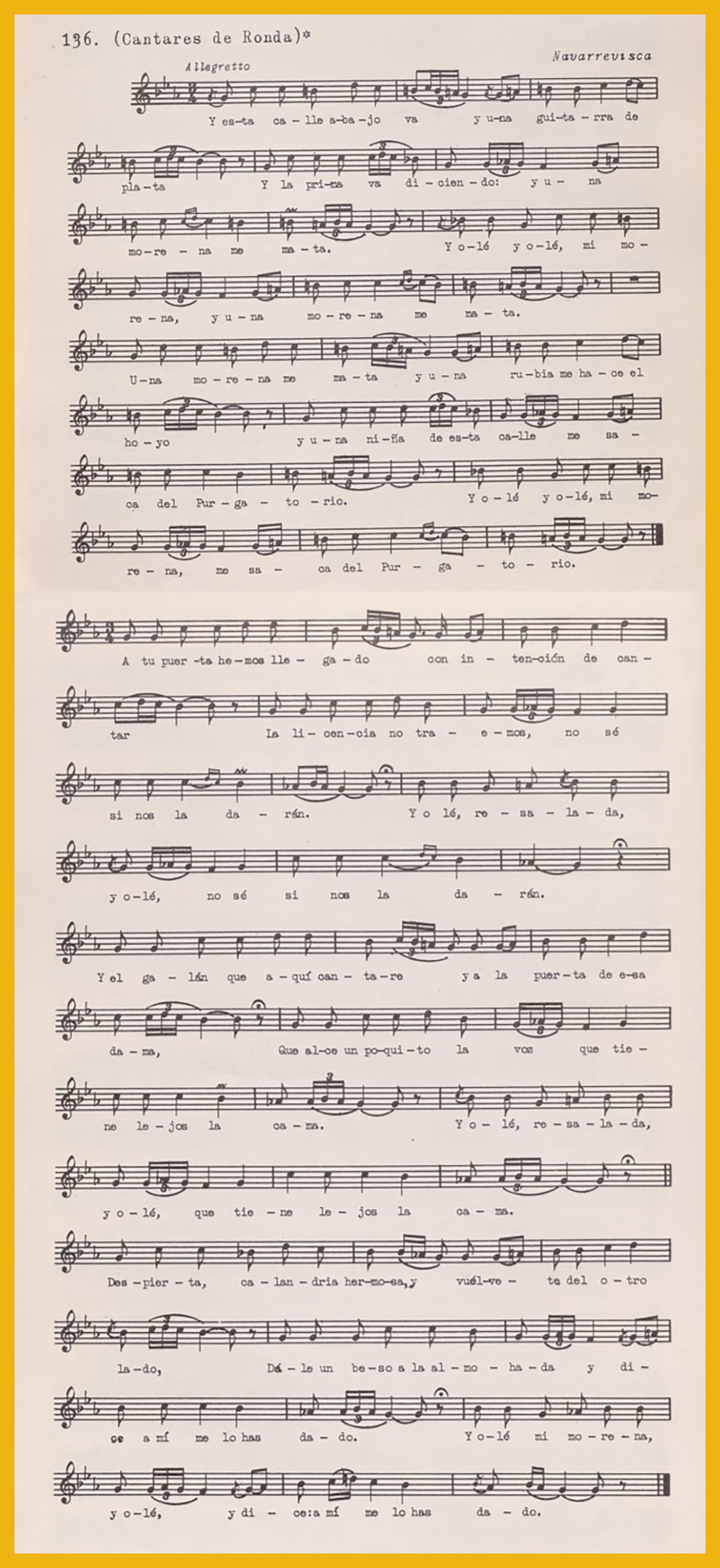 Ref. Partitura transcripción Kurt Schindler (1941): A «Cantares de Ronda», interpretado por Joaquina Presa, Victoria Blázquez y Natividad, registro número 136. «La divina panadera», registro número 137. «La Samaritana (romance)», registro número 139.