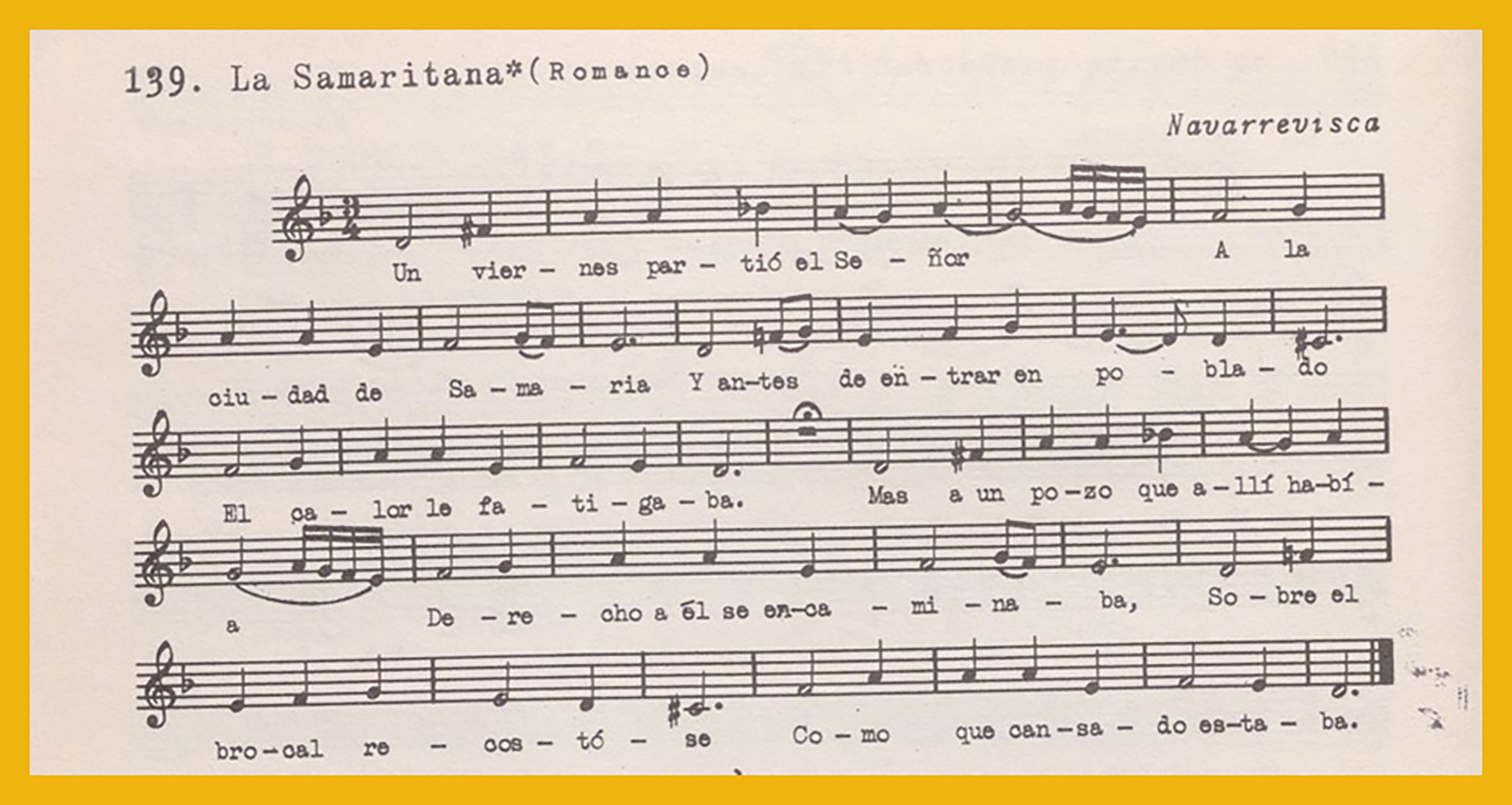 Ref. Partitura transcripción Kurt Schindler (1941): A «Cantares de Ronda», interpretado por Joaquina Presa, Victoria Blázquez y Natividad, registro número 136. «La divina panadera», registro número 137. «La Samaritana (romance)», registro número 139.