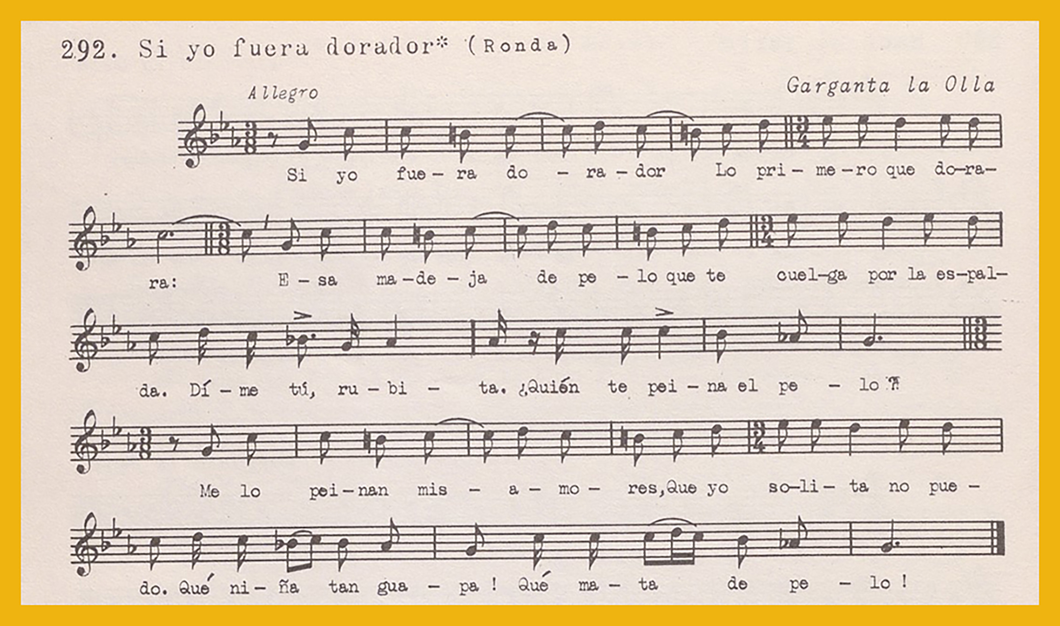 Ref. Partitura transcripción Kurt Schindler (1941): A. «Arenal de Sevilla» y «Canción de Toros» con el íncipit: «Alegría en la cara», registro número 298. B. «Si yo fuera dorador», registro número 292. «Esta calle la rondan los mozos» aparece en los registros como : «A tu puerta puse un guindo», registro número 294