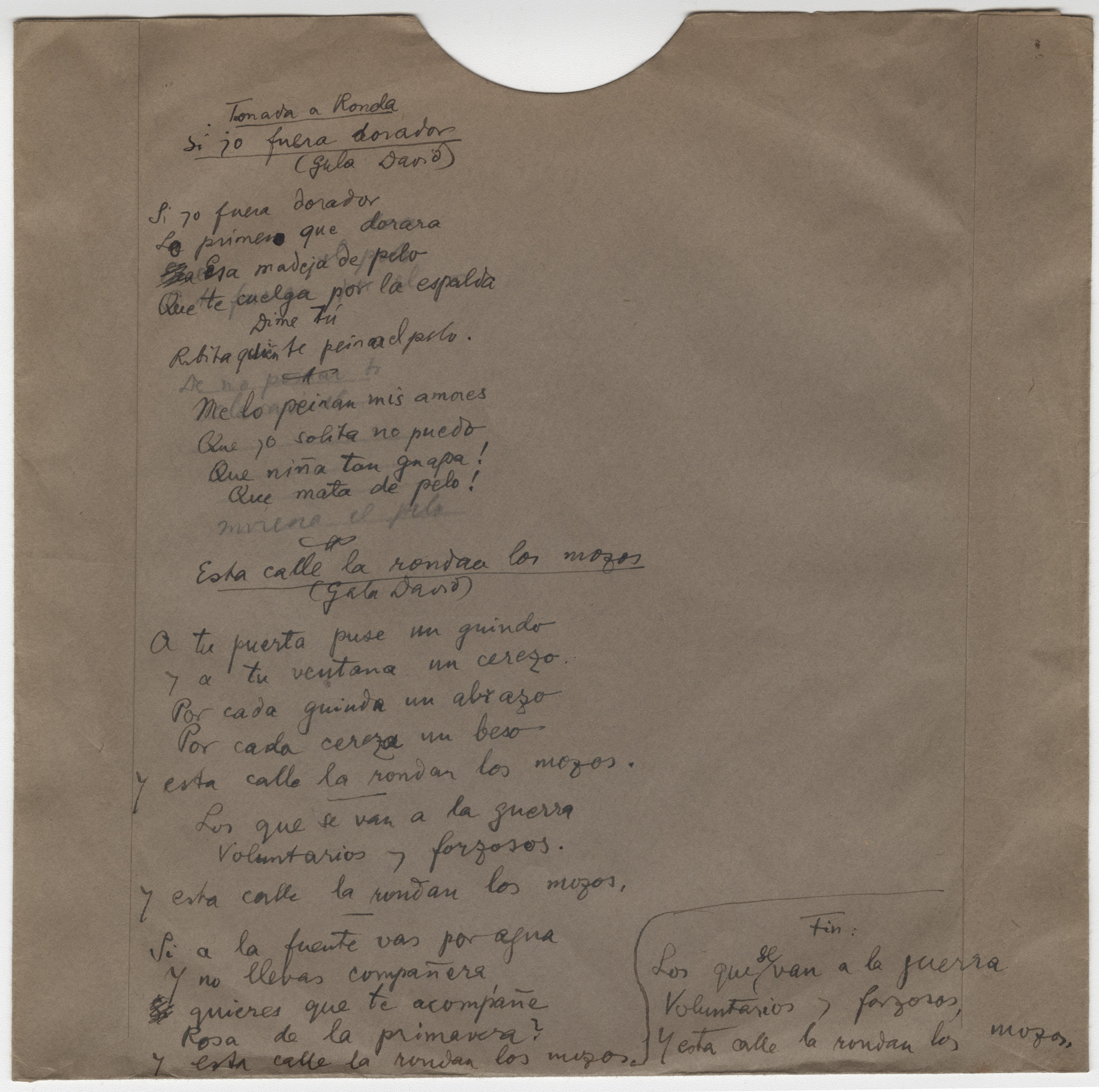 Descripción física: Disco de aluminio. Lleva anotados el lugar y los títulos de las canciones en la etiqueta del disco. En el sobre lleva manuscrito, además, la letra de las canciones.