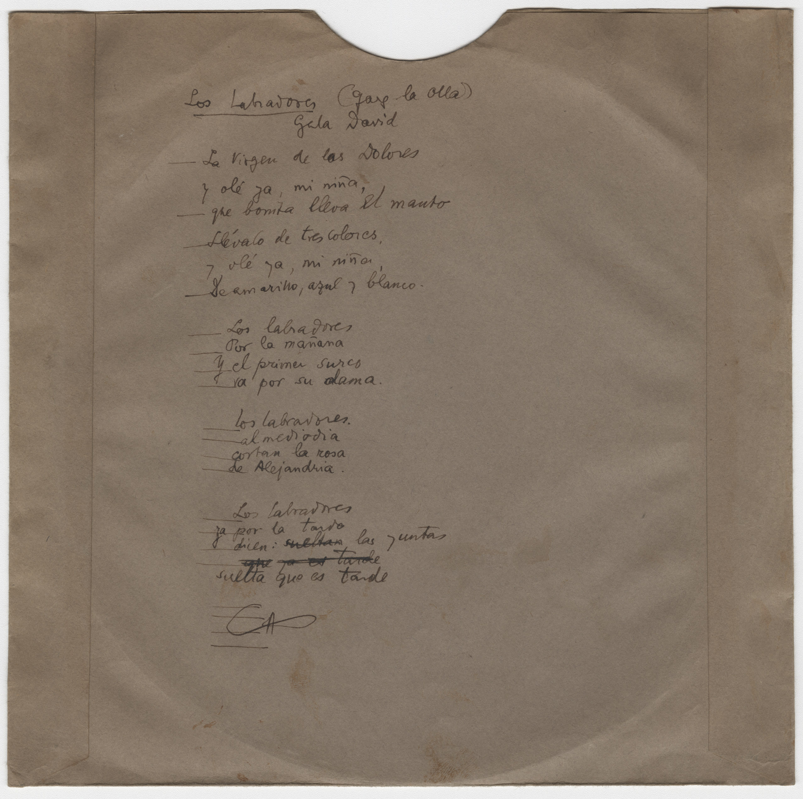 Descripción física: Disco de aluminio. Lleva anotados el lugar y los títulos de las canciones en la etiqueta. En el sobre manuscrito: Garganta de la Olla, títulos y letra de las canciones.