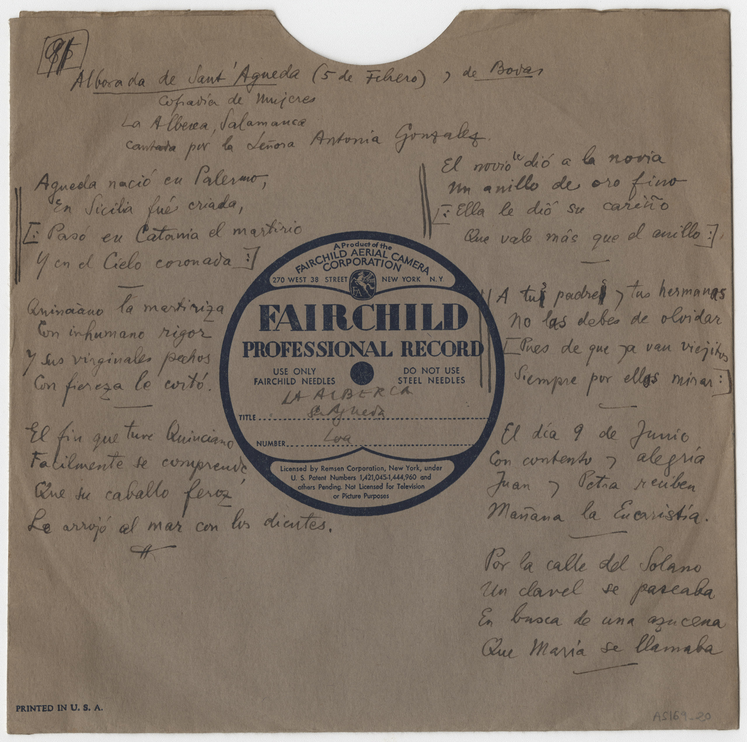 Descripción física: Disco de aluminio. En la etiqueta del disco lleva manuscritos el lugar y los títulos Cantos de Santa Águeda y bodas; ; y Loa. En el sobre lleva como títulos Alborada de Santa Águeda (5 de febrero) y bodas y La loa. Incluye la letra de las canciones y la intérprete Antonia González