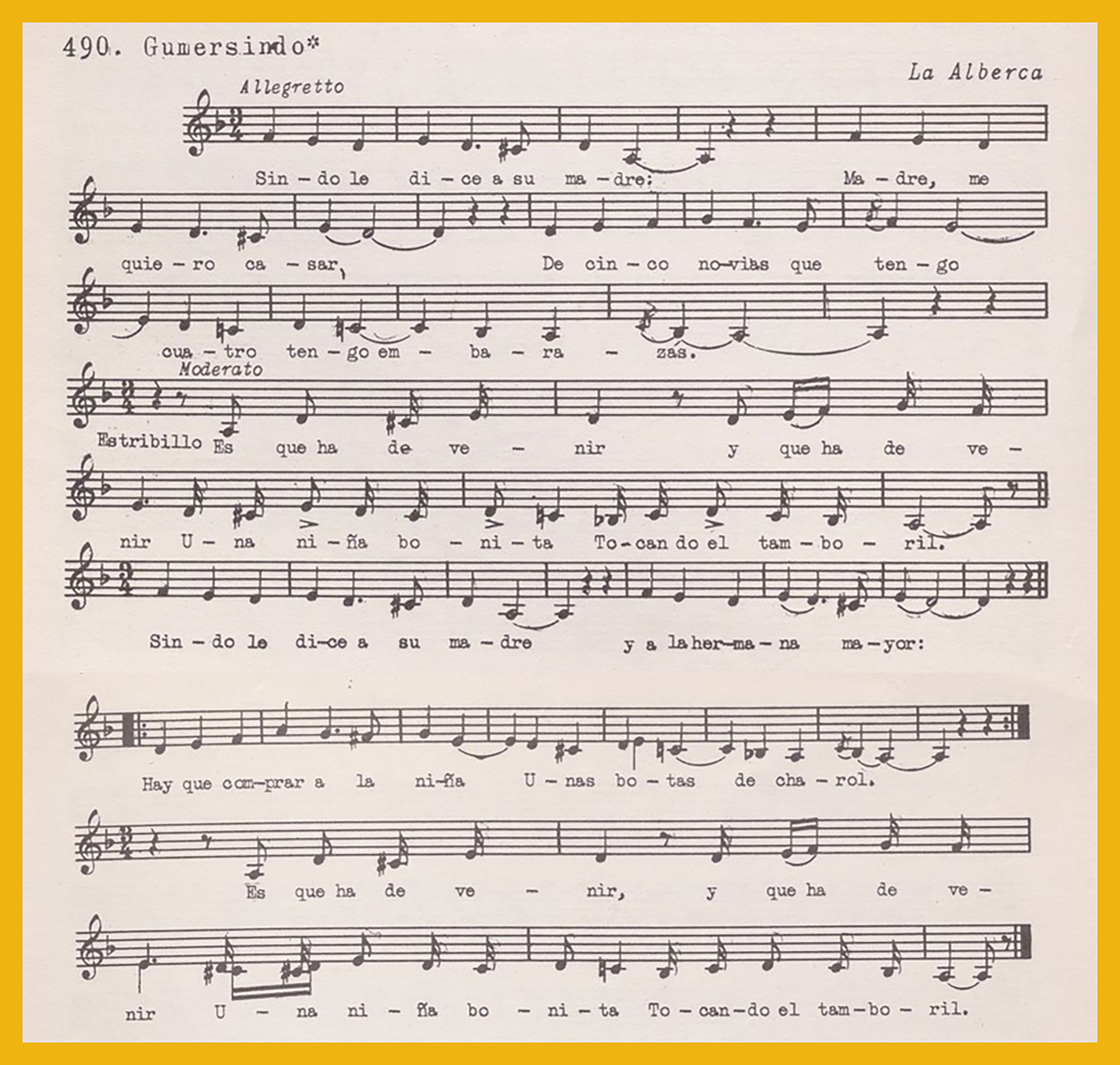 Ref. Partitura transcripción Kurt Schindler (1941): A. «Gumersindo», registro número 490. B. «A Belén pastores (Villancico)», registro número 491