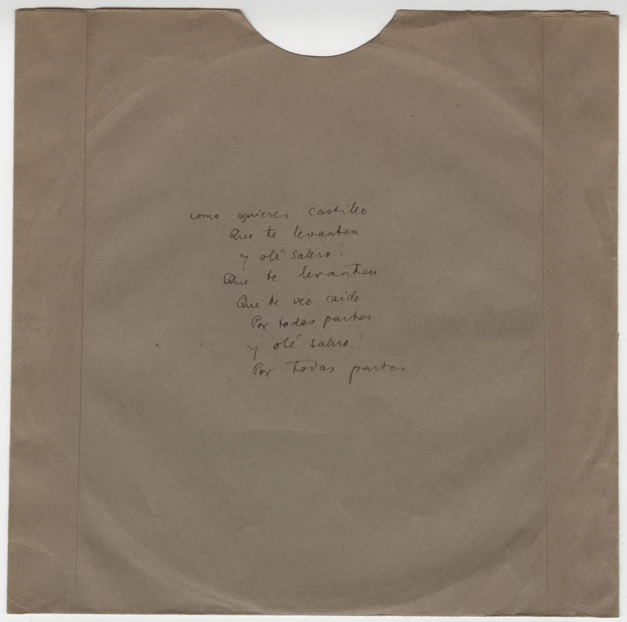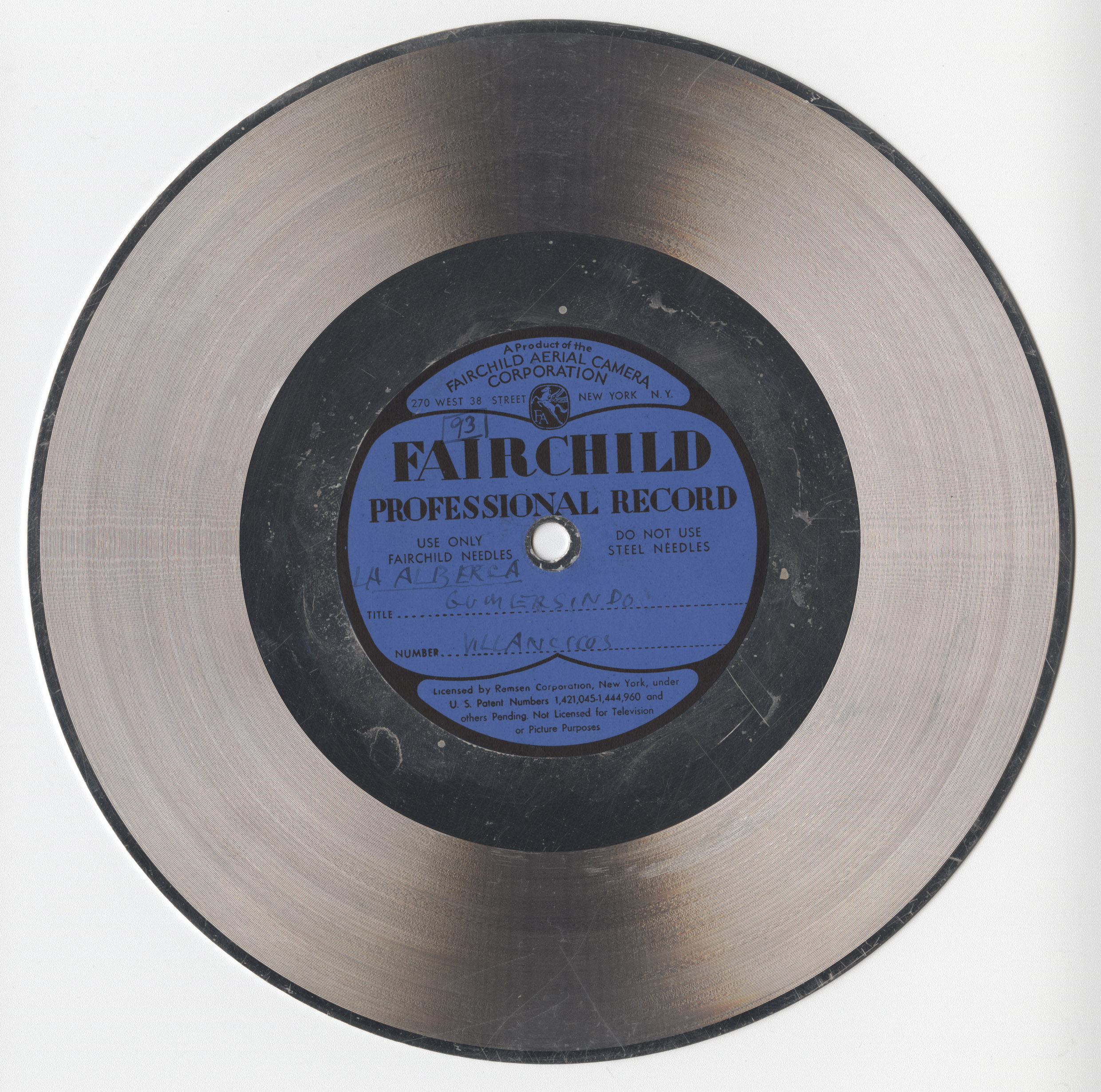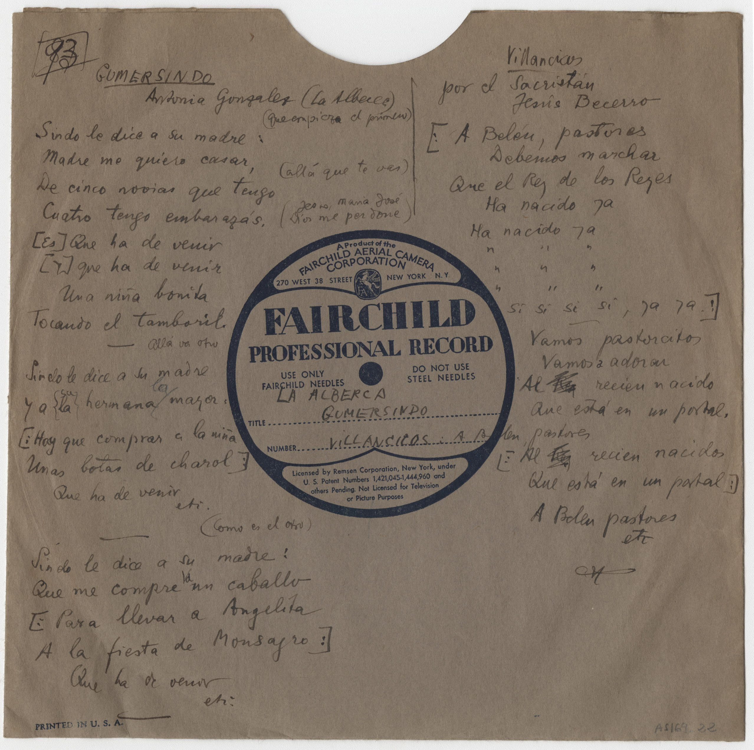 Descripción física: Disco de aluminio. En la etiqueta del disco lleva manuscritos el lugar y los títulos. En el sobre lleva, además, las letras de las canciones y los intérpretes: Antonia González y Jesús Becerro (Sacristán).