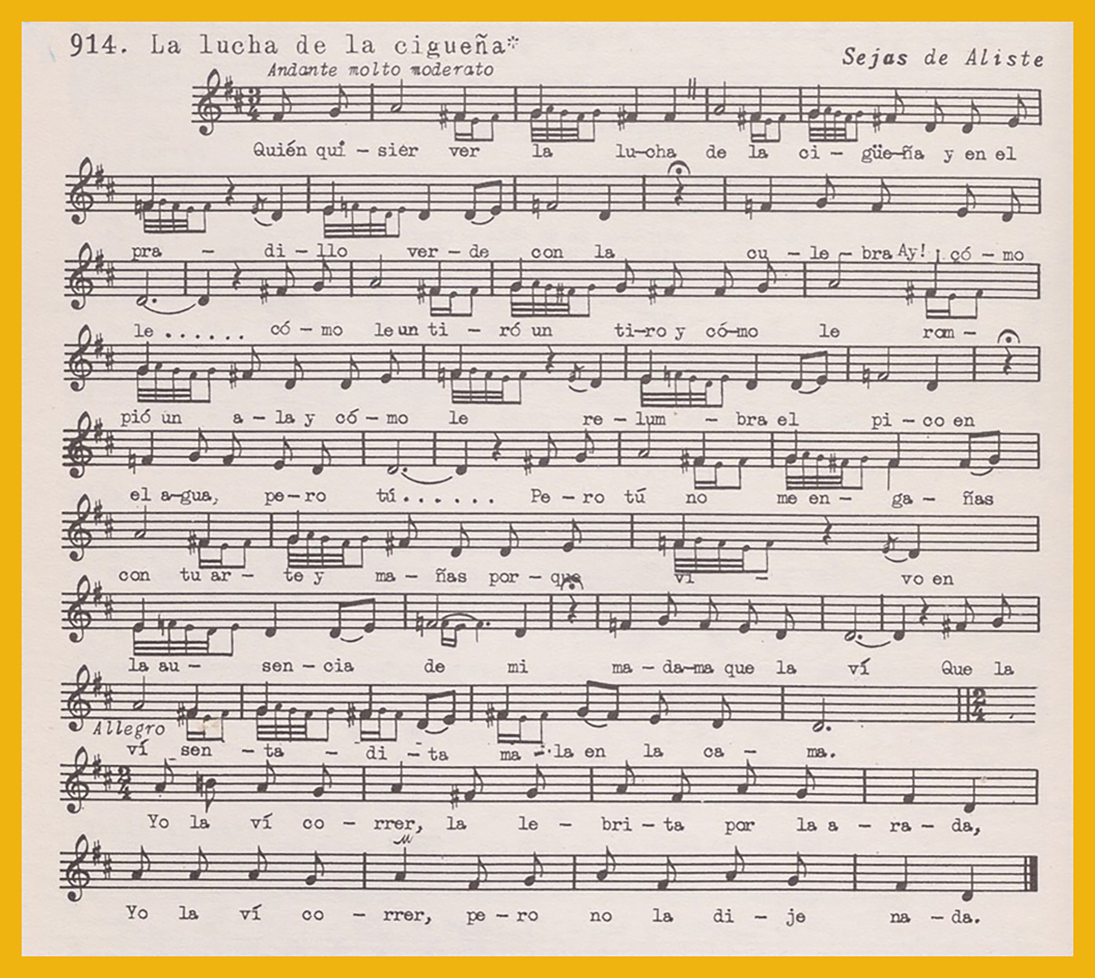 Ref. Partitura transcripción Kurt Schindler (1941): A. «Catalina es el oro», registro número 913. B. «La lucha de la cigüeña», registro número 914
