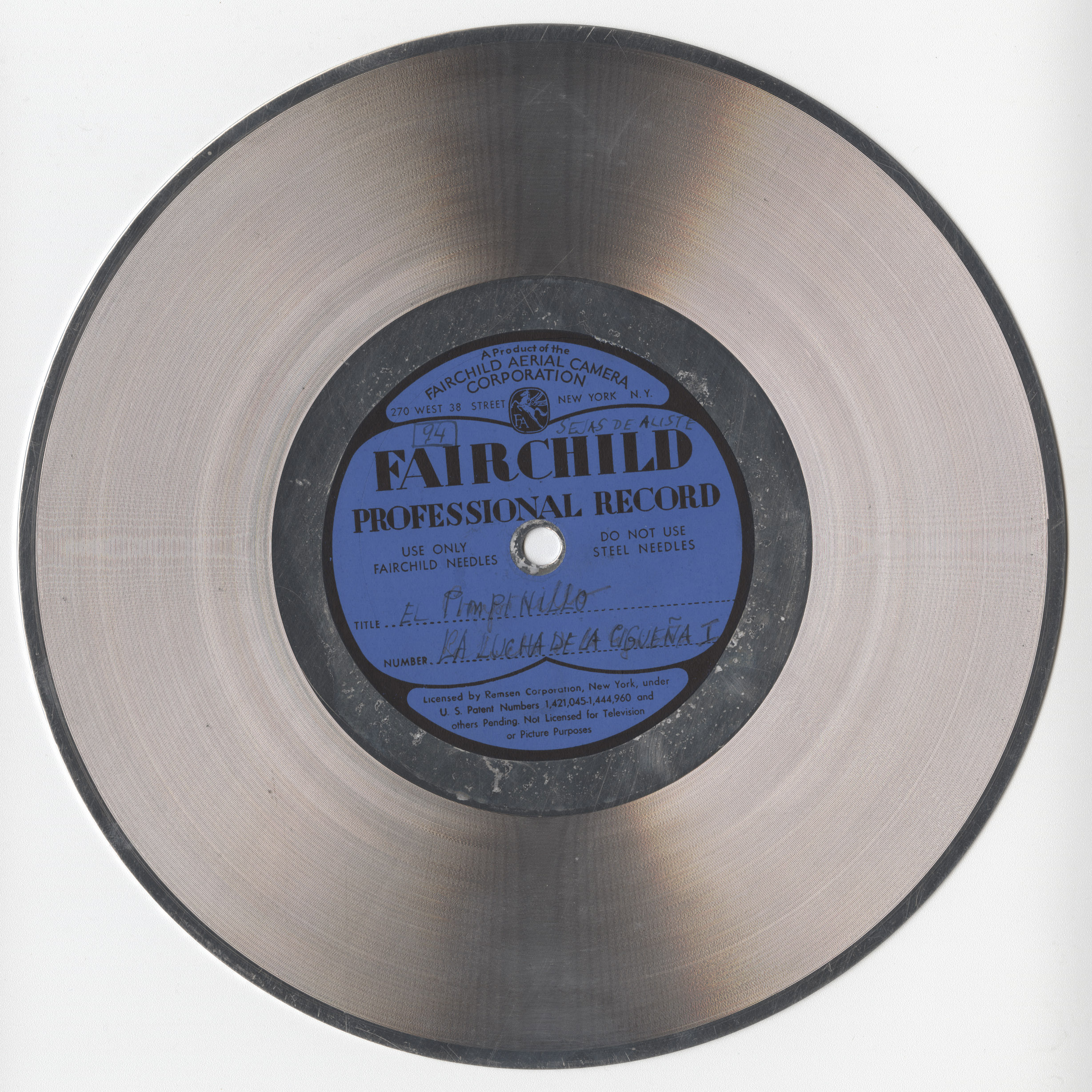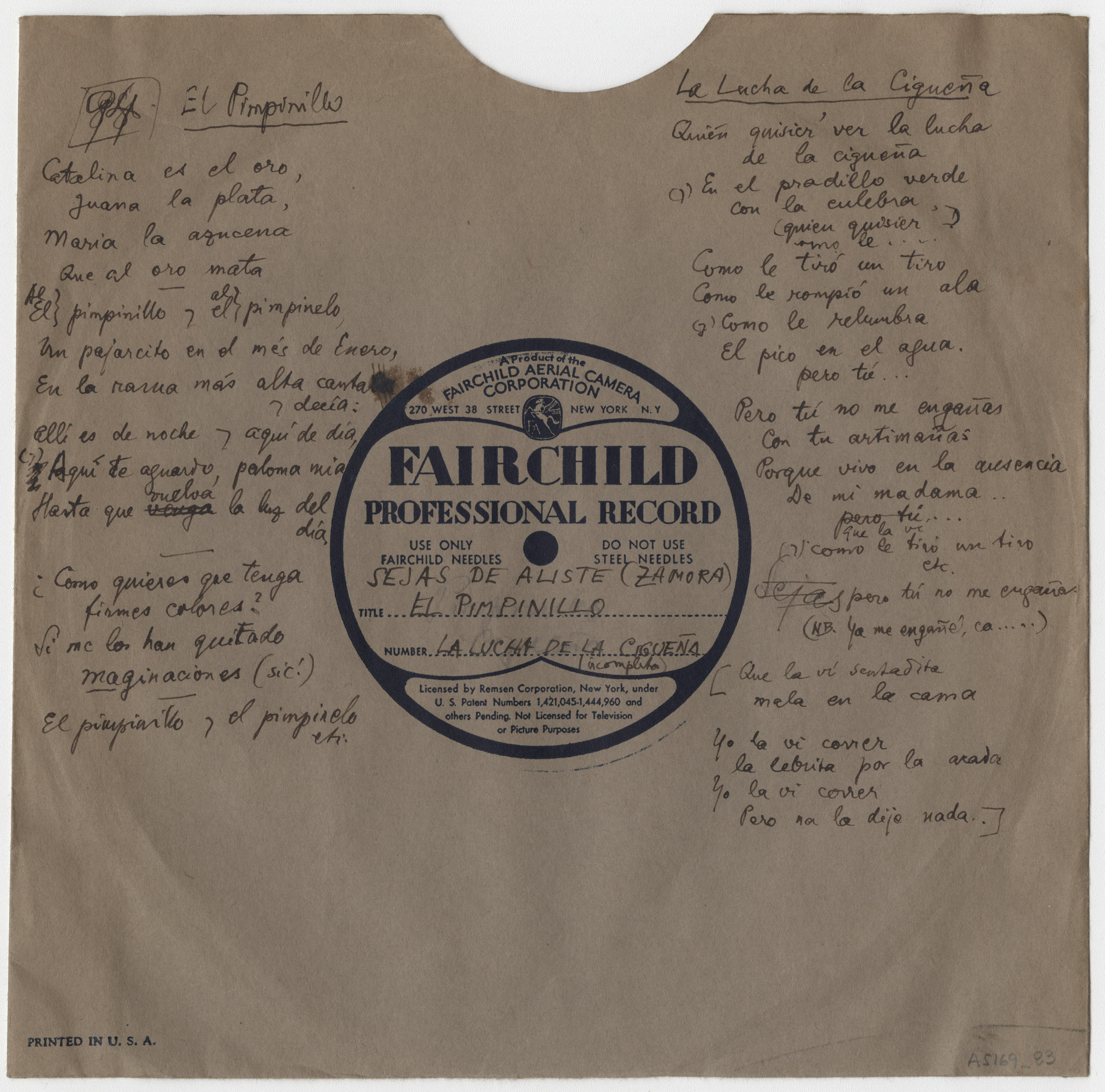 Descripción física: Disco de aluminio. En la etiqueta del disco lleva manuscritos el lugar y los títulos, y en el sobre las letras de las canciones.