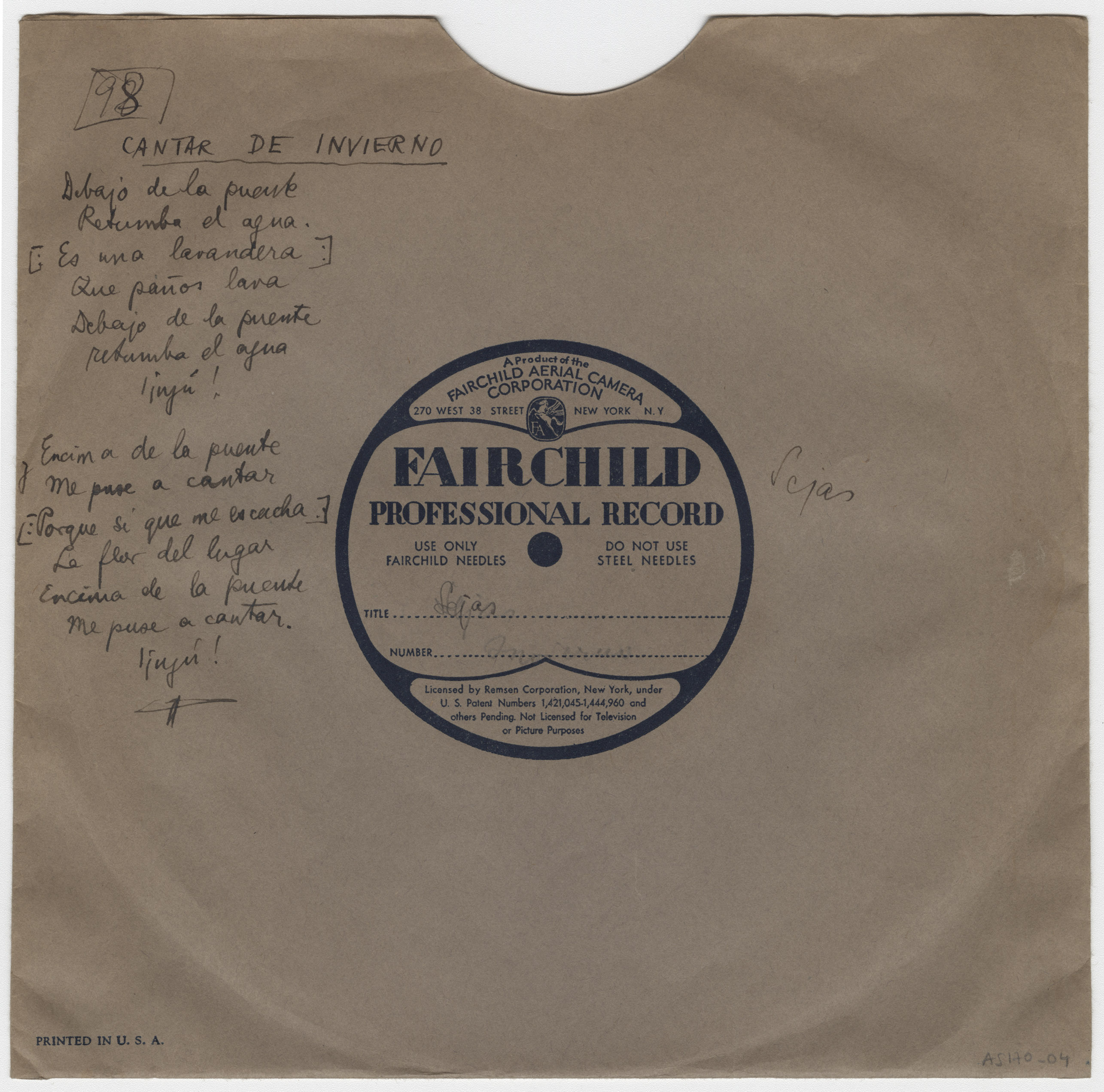 Descripción física: Disco de aluminio. En la etiqueta del disco lleva manuscritos el lugar y el título y en el sobre lleva la letra de la canción.
