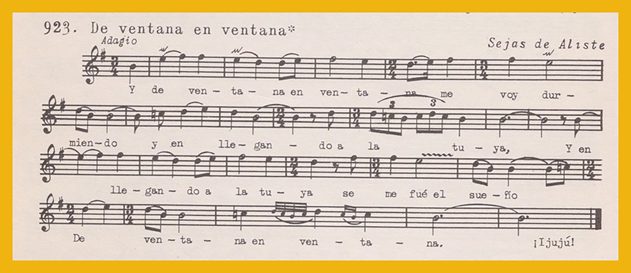 Ref. Partitura transcripción Kurt Schindler (1941): A. «Cuando el bien de mi vida (cantar de primavera», registro número 921. «A la sombra del tejado», registro número 922. B. «De ventana en ventana», registro número 923. «Estrella», registro número 924