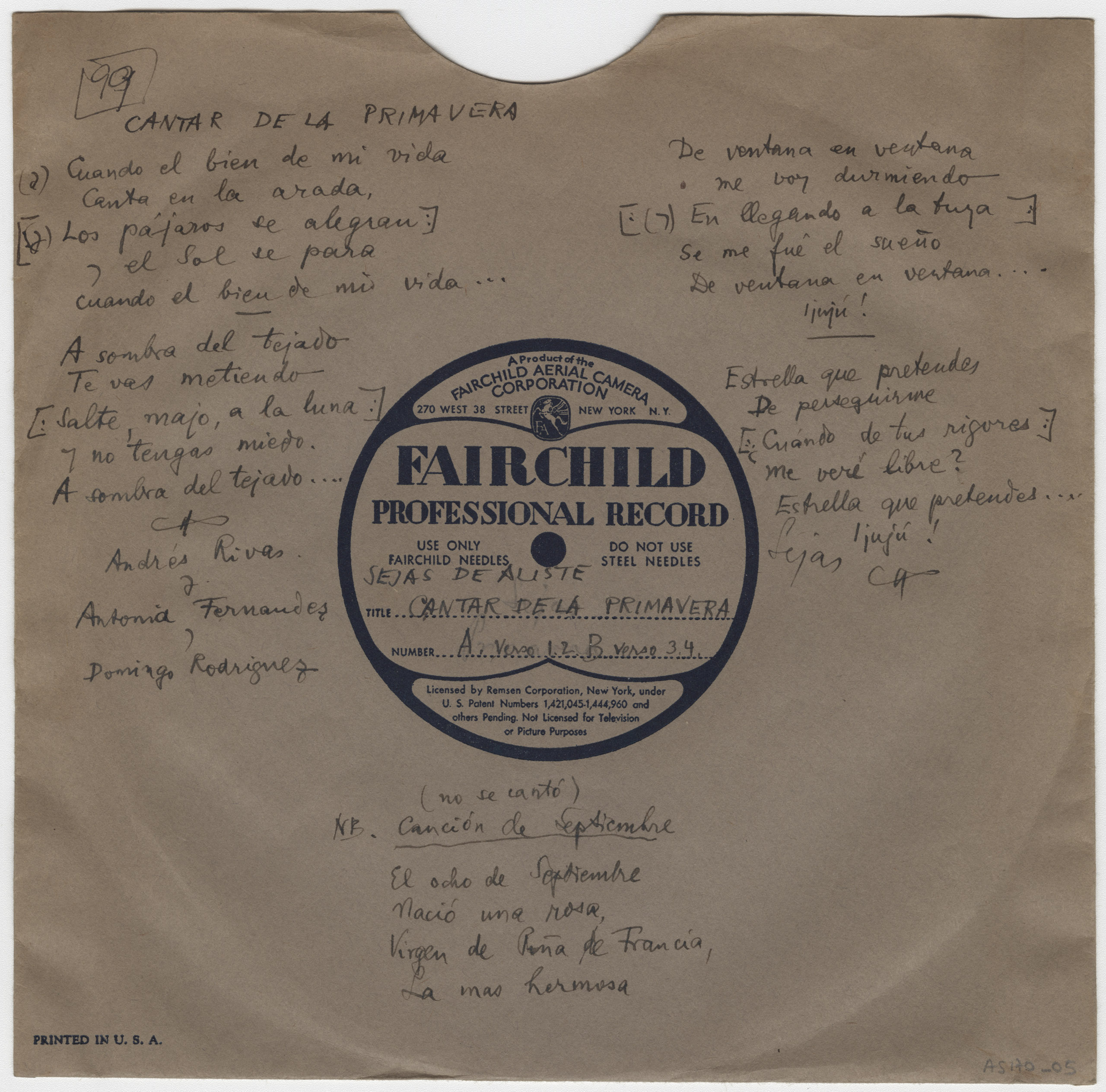 Descripción física: Disco de aluminio. En la etiqueta del disco lleva manuscritos el lugar, el título y los intérpretes, Andrés Ribas, Domingo Rodríguez y Antonia Fernández. En el sobre lleva la letra de la canción y anotado : [cara] A verso 1, 2; ; [cara] B verso 3, 4. Lleva, además, una estrofa de Canción de Septiembre, que no está grabada en el disco.