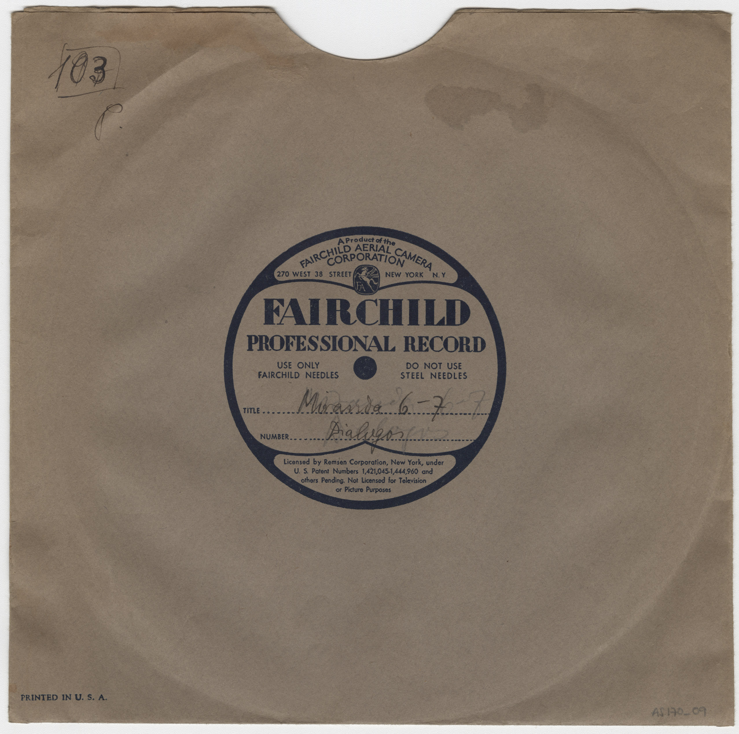 Descripción física: Disco de aluminio. En la etiqueta del disco lleva manuscritos el lugar y el título al igual que en el sobre. Aunque está identificado como Miranda se trata de la localidad portuguesa de Miranda Do Douro lindando con la provincia de Zamora.