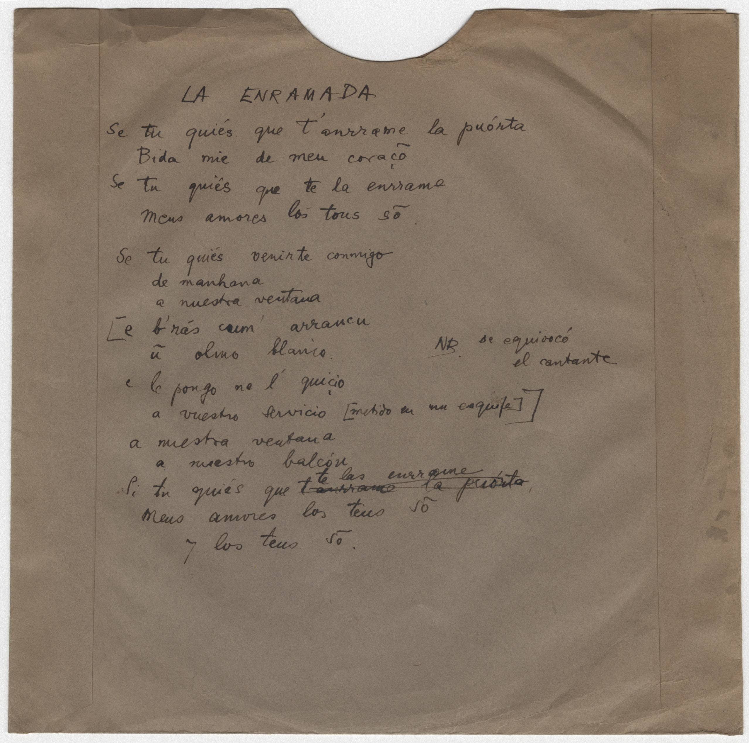 Descripción física: Disco de aluminio. En la etiqueta del disco lleva manuscritos el lugar y los títulos. En el sobre lleva, además, la letra de las canciones. Aunque está identificado como Miranda se trata de la localidad portuguesa de Miranda Do Douro lindando con la provincia de Zamora.