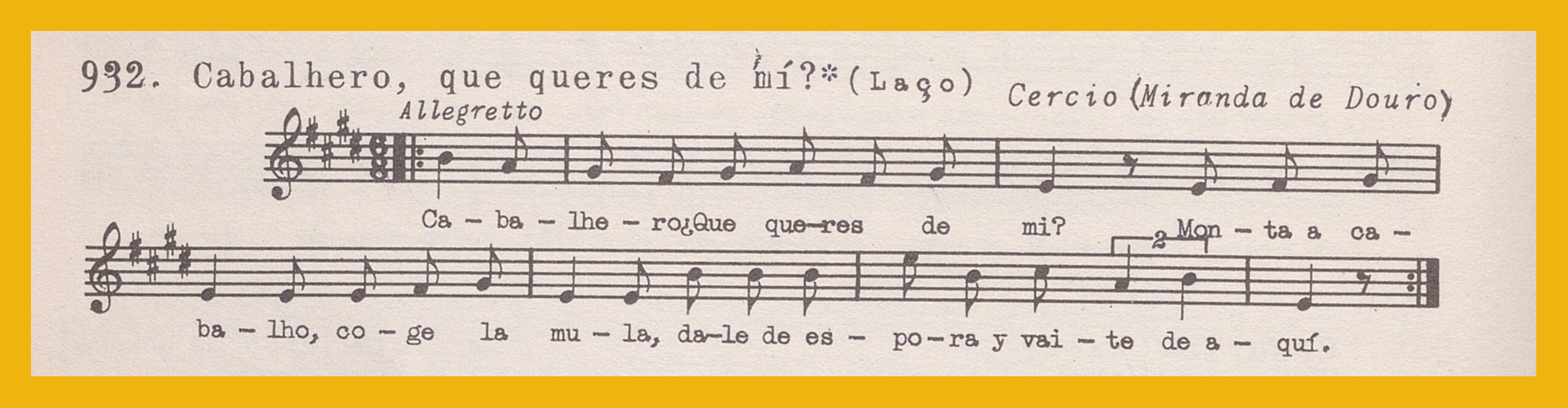 Ref. Partitura transcripción Kurt Schindler (1941): «Cabalhero, que queres de mí? (Laço)», registro número 932