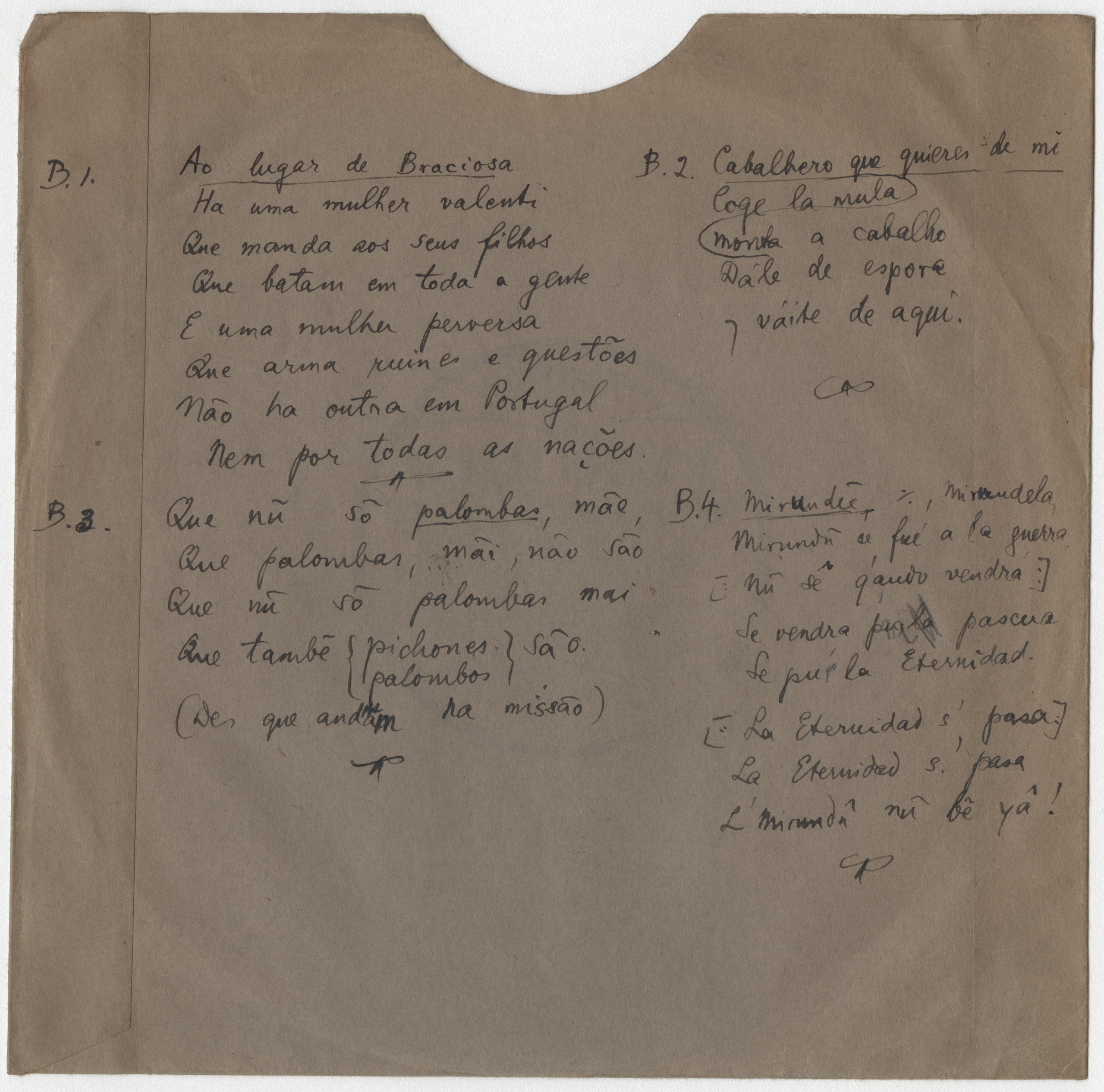 Descripción física: Disco de aluminio. En la etiqueta del disco lleva manuscritos el lugar y los títulos. En el sobre lleva, además, la letra de las canciones. Cércio pertenece a Miranda Do Douro, una localidad portuguesa que linda con la provincia de Zamora.