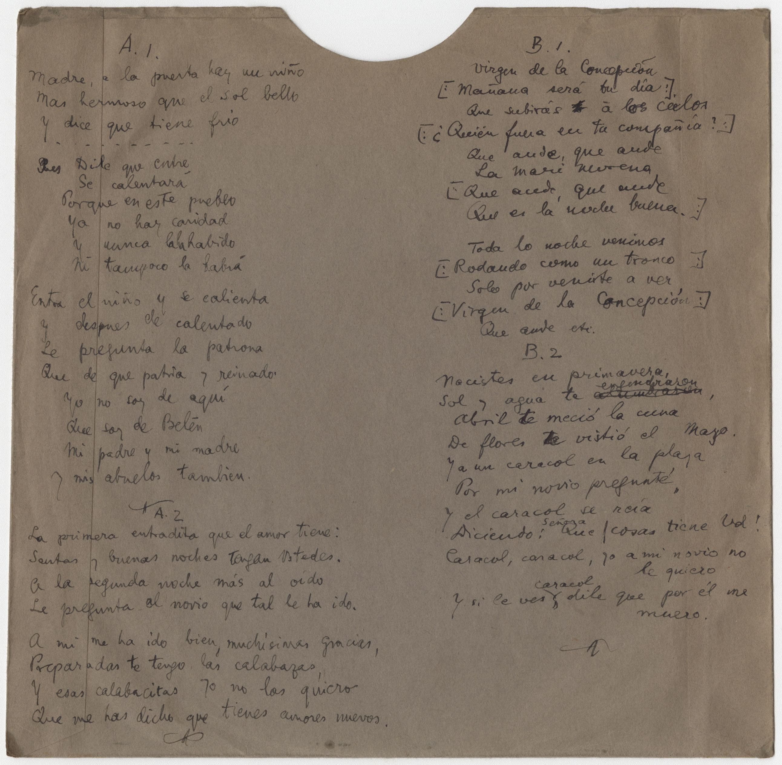 Ref. Partitura transcripción Kurt Schindler (1941): A. «Madre, a la puerta hay un niño», registro número 312. «La primera entradita del amor», registro número 313. B.«Virgen de la Concepción», registro nº 314. «Nacistes en primavera», registro nº 315