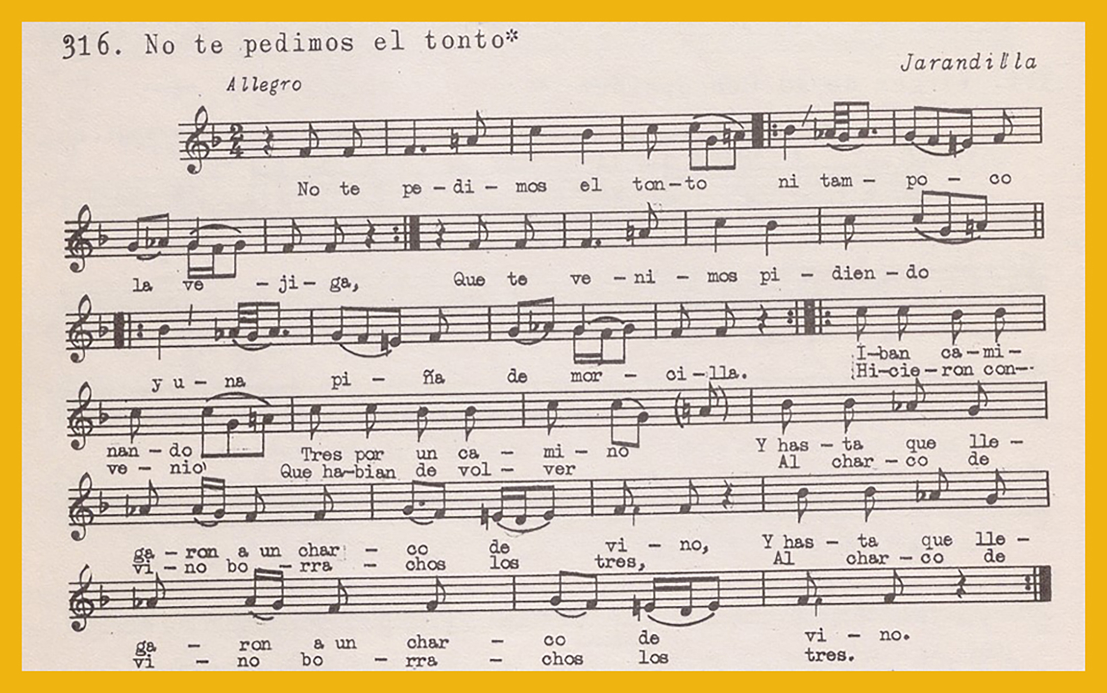Ref. Partitura transcripción Kurt Schindler (1941):A. «No te pedimos el tonto», registro número 316. «Que coloritán! (Romance)», registro número 317. B.«El trébole treboleado», registro nº 318.«El trébole», registro nº 319