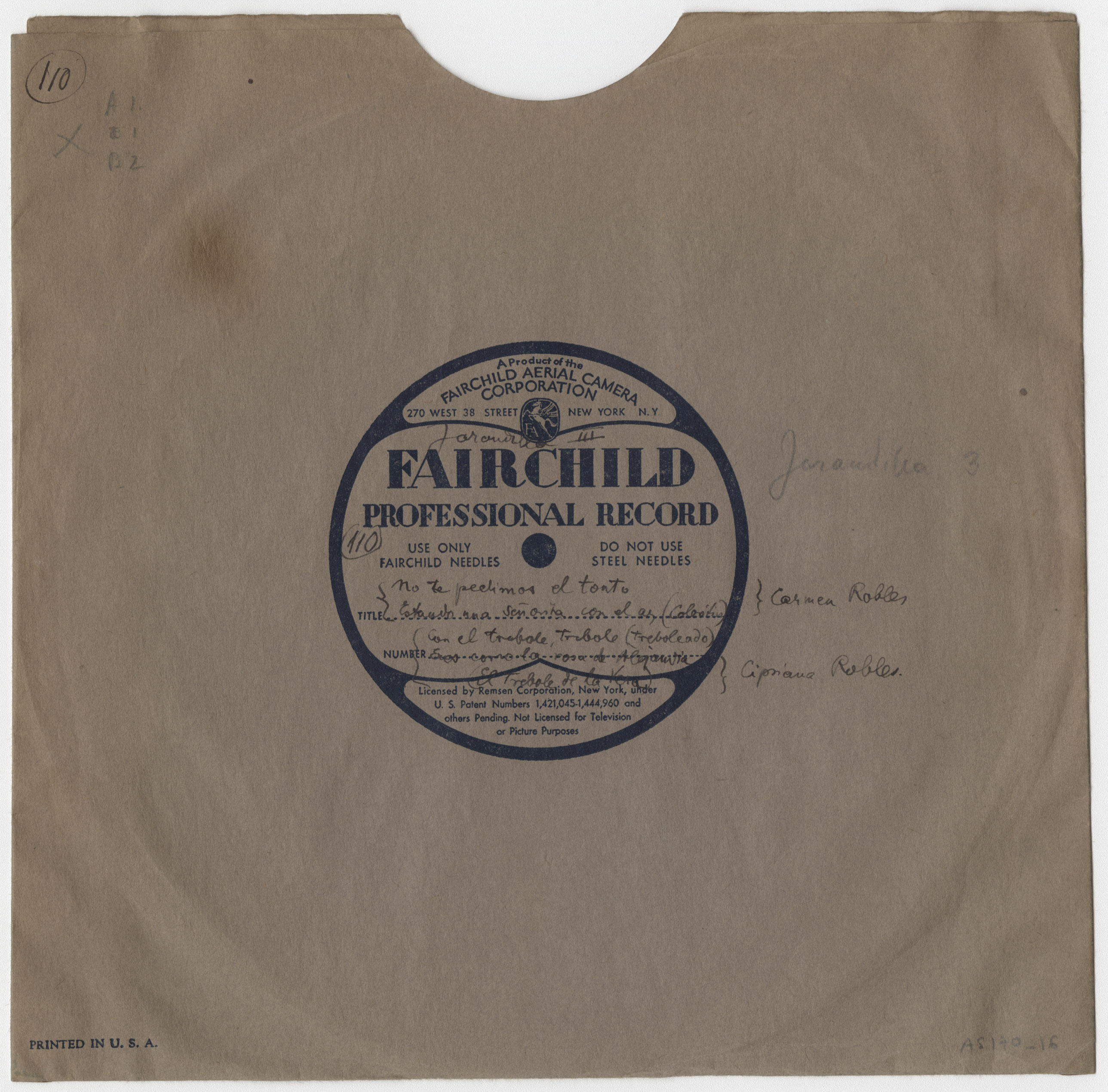 Descripción física: Disco de aluminio. Lleva anotados los títulos de las canciones y las intérpretes en la pegatina del disco. El sobre está manuscrito: Jarandilla III, título e intérpretes. Las letras de las canciones aparecen anotadas por detrás. Acompañado de una cuartilla con la letras de las canciones manuscritas.