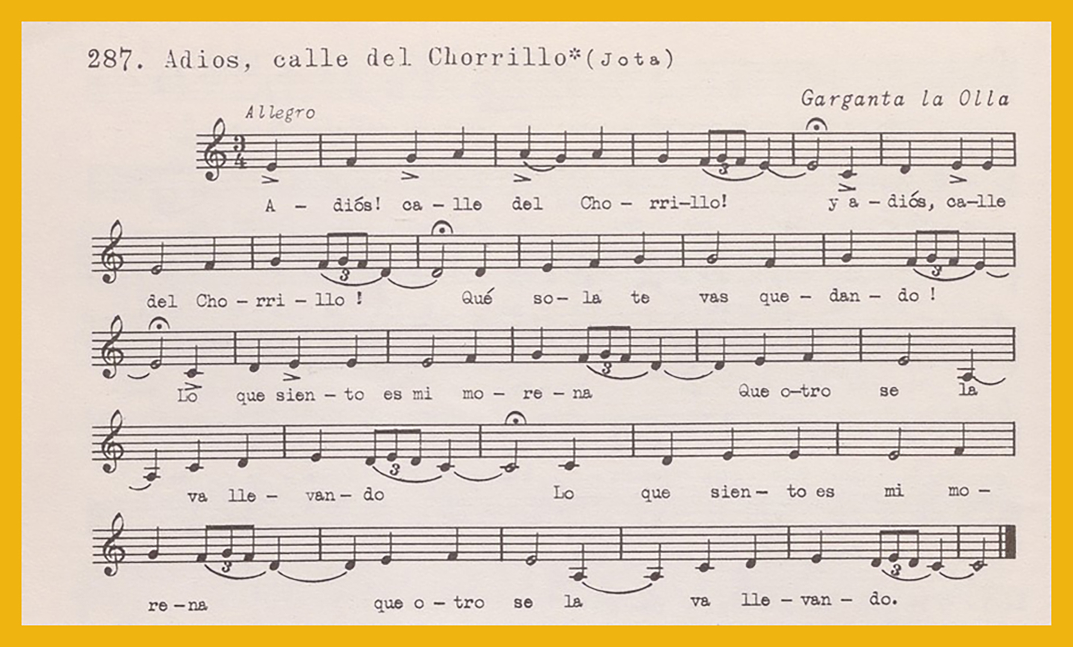 Ref. Partitura transcripción Kurt Schindler (1941): A. Ay chiquitita no llores aparece como «Tienes en tu cara pecas», registro número 286. Canción de Quintos «Adiós, calle del chorrillo (jota)», registro número 287. B. «Tiene la molinera ricas puntillas», registro número 288.